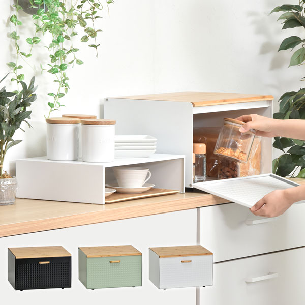 取り外しできるスチールの中棚付き大型ブレッドケース TREE。前面の扉と天板が開くので出し入れしやすく、生活感のあふれる雑貨をまとめて収納できてキッチンにおしゃれですっきりとした印象を与えます。カラーはブラック、ライトグリーン、ホワイトの3色からお選びいただけます。