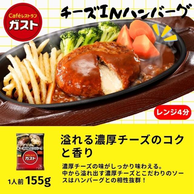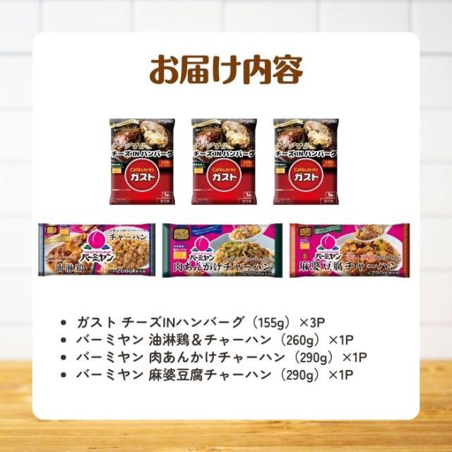 【商品内容】 ガスト チーズINハンバーグ(155gソース入り)×3 バーミヤン 肉あんかけチャーハン(290g)×1 バーミヤン 麻婆豆腐チャーハン(290g)×1 バーミヤン 油淋鶏チャーハン(260g)×1
