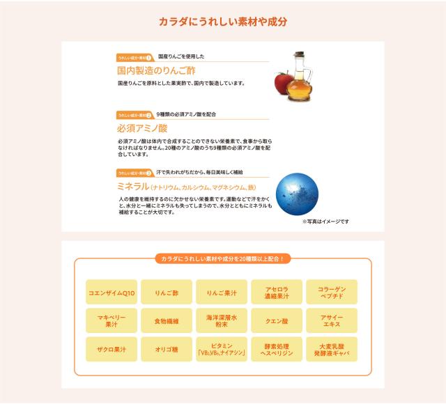 果糖ぶどう糖液糖(国内製造)、りんご果汁、りんご酢、イソマルトオリゴ糖、はちみつ、水溶性食物繊維、ザクロ果汁、フィッシュコラーゲンペプチド(ゼラチンを含む)、海洋深層水粉末、大麦乳酸発酵液ギャバ、アセロラ濃縮果汁粉末、マキベリー果汁、アサイーエキス末、コエンザイムQ10、食用油脂/クエン酸(Na)、乳酸Ca、甘味料(ステビア)、クエン酸鉄Na、香料、ナイアシン、酸化Mg、アントシアニン色素、ロイシン、酵素処理ヘスペリジン、酸化防止剤(酵素処理ルチン)、ビタミンB6、バリン、イソロイシン、フェニルアラニン、リジン塩酸塩、トレオニン、ビタミンB2、グリセリン、メチオニン、ヒスチジン、乳化剤(大豆由来)、トリプトファン、ビタミンD