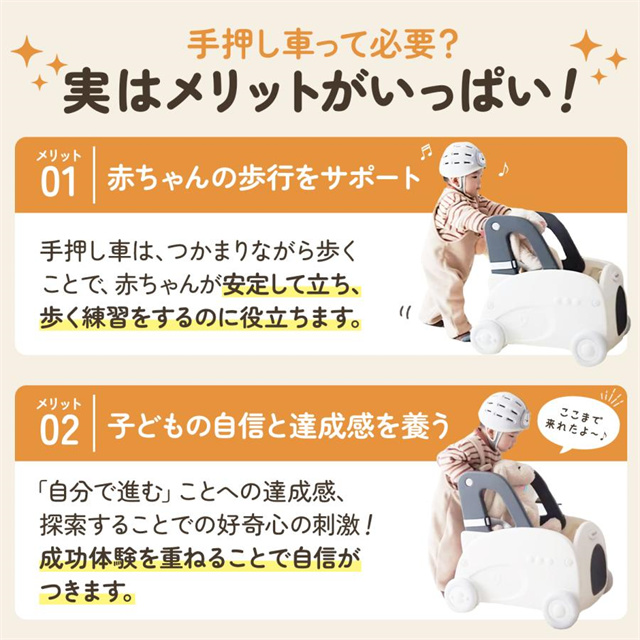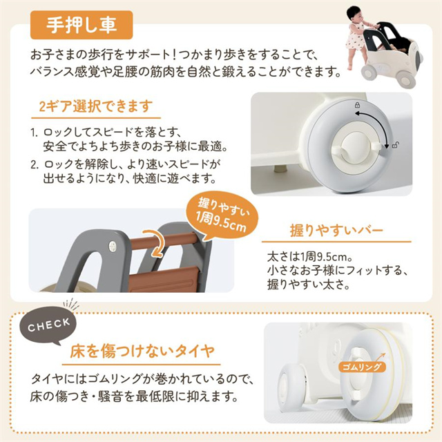 赤ちゃんが一歩ずつ歩き始める大切な時期を応援する、シンプルでかわいい手押し車。