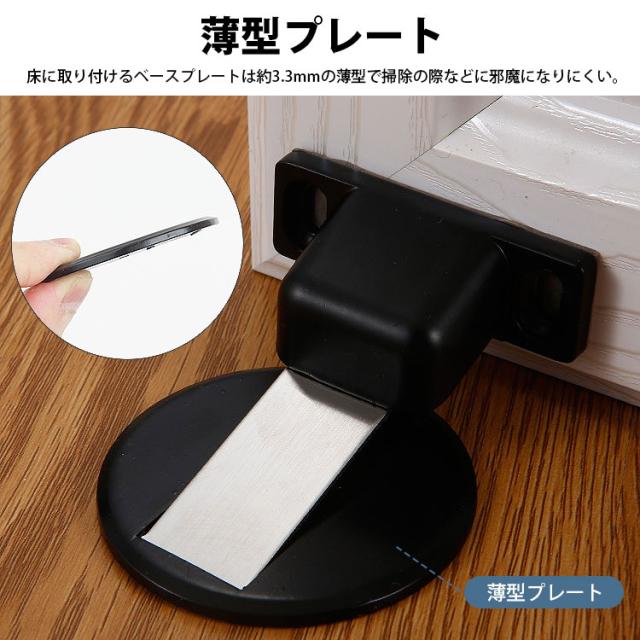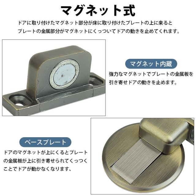 ドアに取り付けたマグネット部分が床に取り付けたプレートの上に来るとプレートの金属部分がマグネットにくっついてドアの動きを止めてくれます。