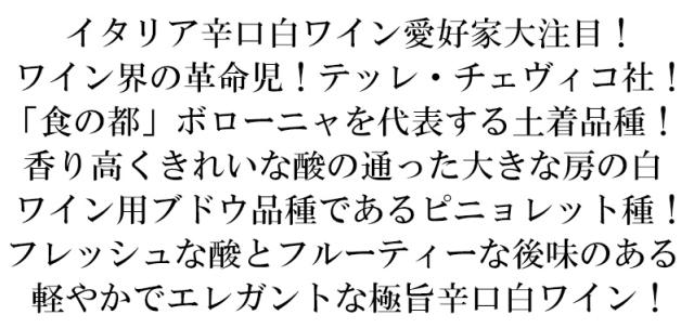 イタリア辛口白ワイン愛好家大注目! ワイン界の革命児!テッレ・チェヴィコ社! 「食の都」ボローニャを代表する土着品種! 香り高くきれいな酸の通った大きな房の白 ワイン用ブドウ品種であるピニョレット種! フレッシュな酸とフルーティーな後味のある 軽やかでエレガントな極旨辛口白ワイン!