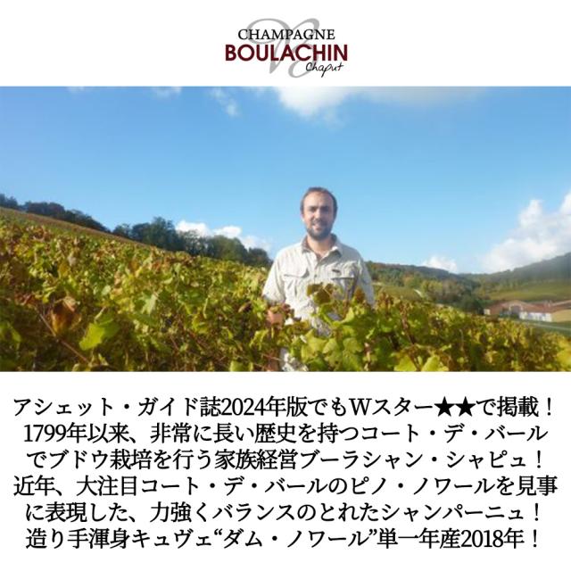 アシェット・ガイド誌2024年版でもWスター★★で掲載!1799年以来、非常に長い歴史を持つコート・デ・バール でブドウ栽培を行う家族経営ブーラシャン・シャピュ!近年、大注目コート・デ・バールのピノ・ノワールを見事に表現した、力強くバランスのとれたシャンパーニュ!造り手渾身キュヴェ“ダム・ノワール”単一年産2018年!