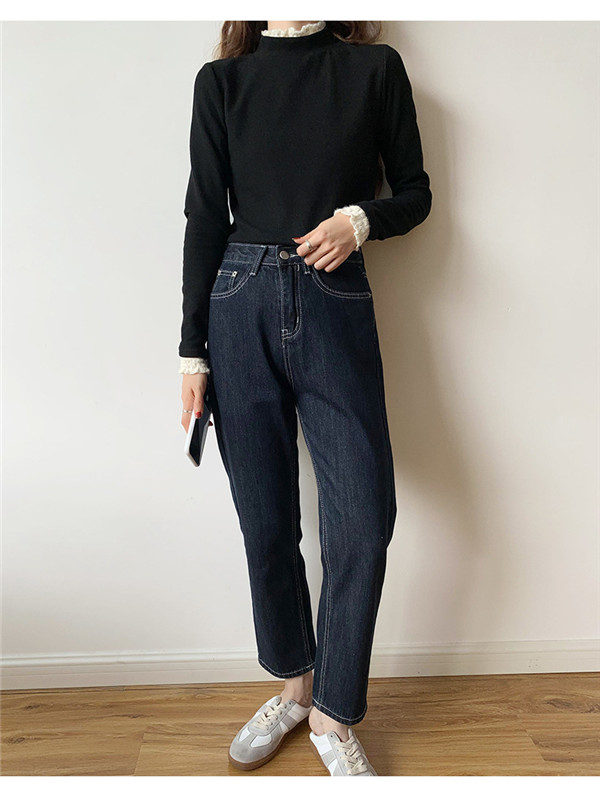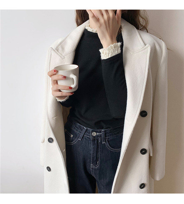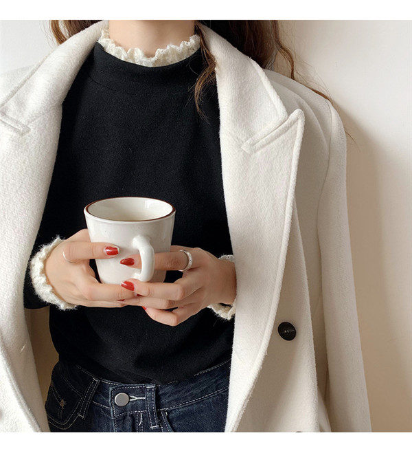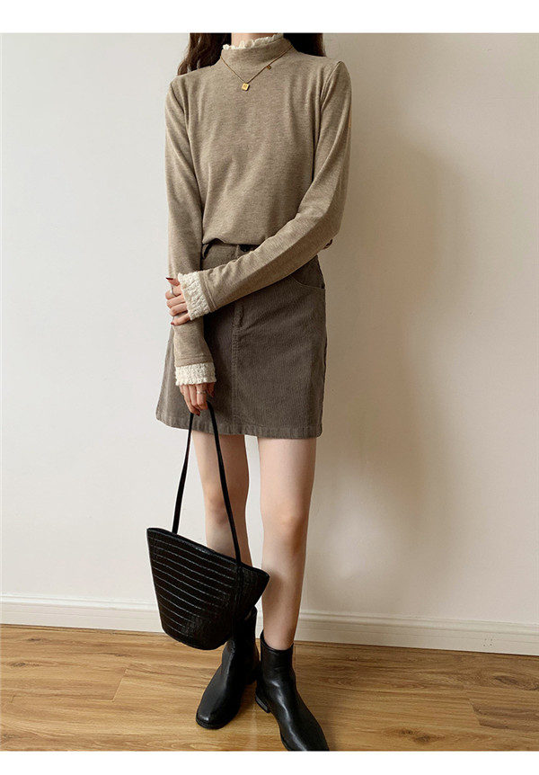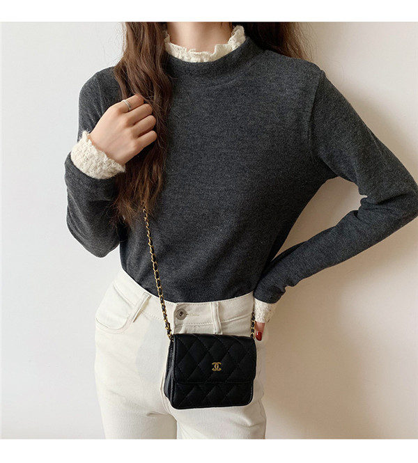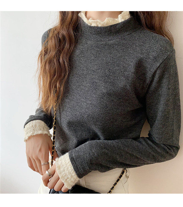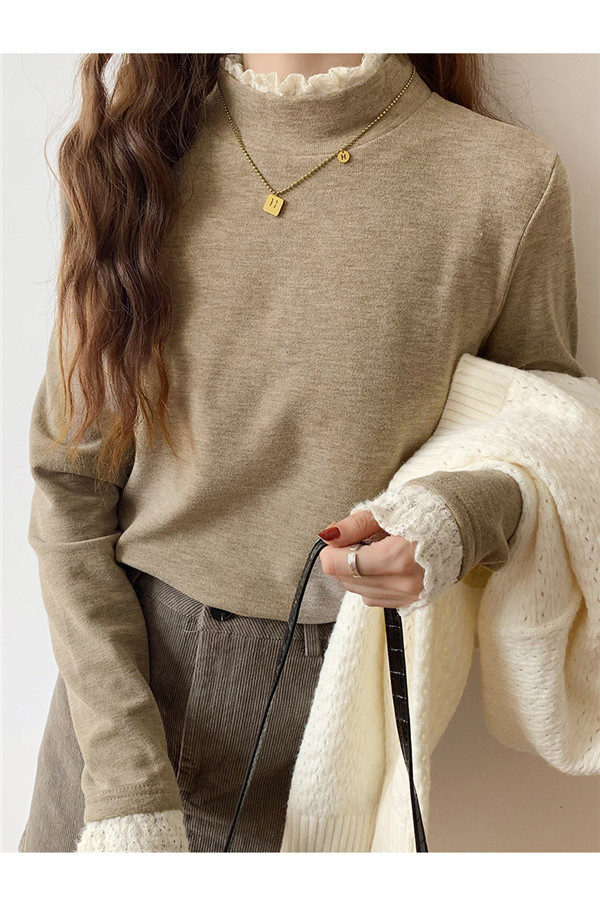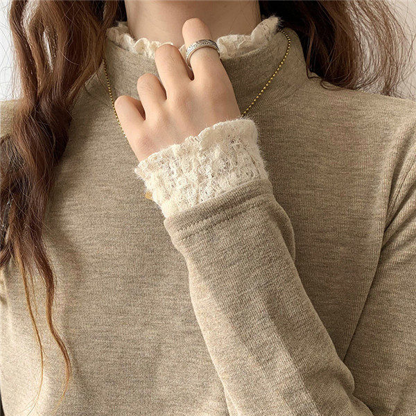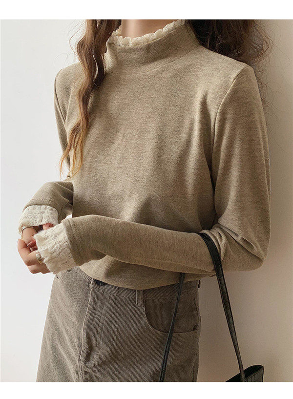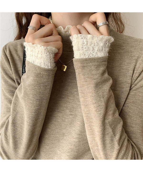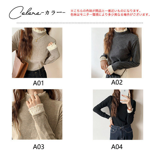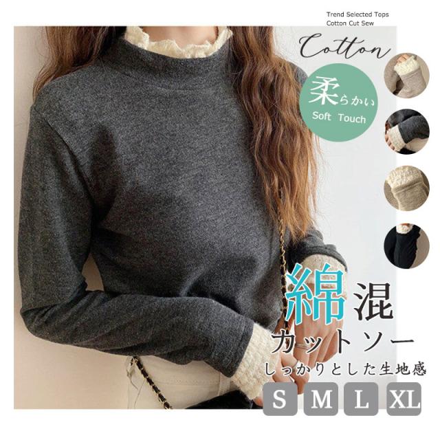 カットソー レディース Tシャツ 長袖tシャツ レース 切り替え 袖口フリル ハイネック ストレッチ きれいめ シンプル 厚手 秋冬 冬服