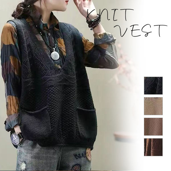 トップス ベスト ケーブル編み 無地 ノースリーブ Vネック スポーティー カジュアル 大人 秋冬物