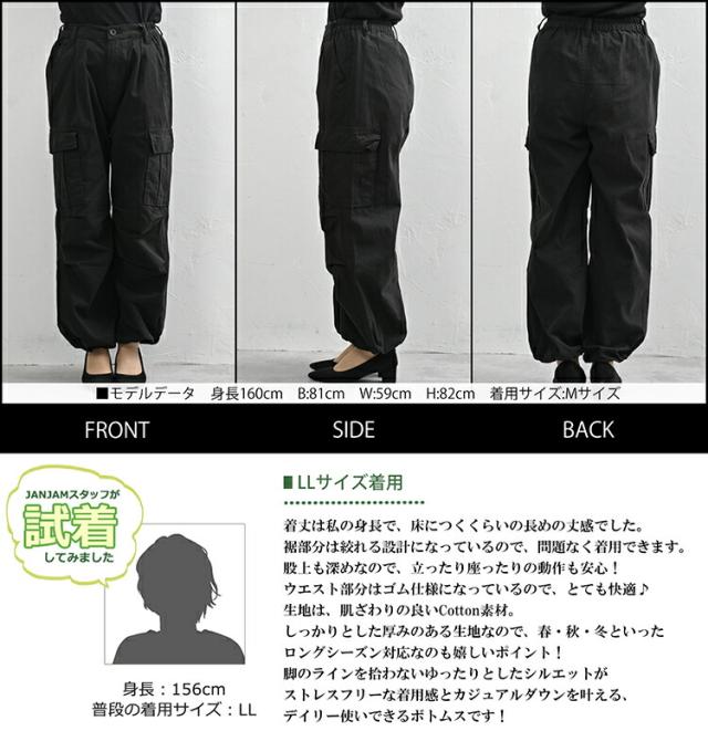 送料無料※沖縄/北海道対象外 大きいサイズ レディース カーゴパンツ ロング丈 バックウエストゴム 裾調節可能 cotton100 ボトムス LL/3L/4L ゆったりサイズ ぽっちゃり女子 プラスサイズ