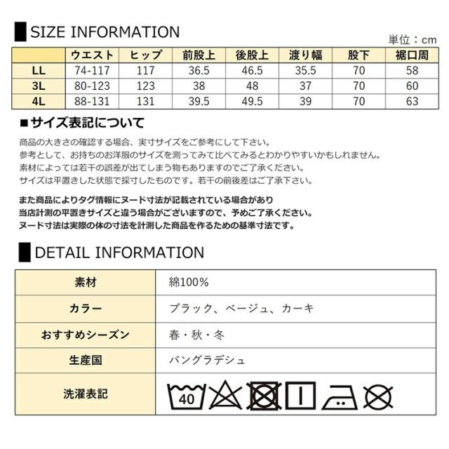 3L:ウエスト80-123 ヒップ123 前股上38 後股上48 渡り幅37 股下70 裾口周60