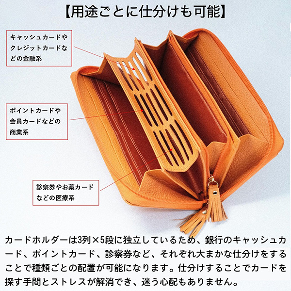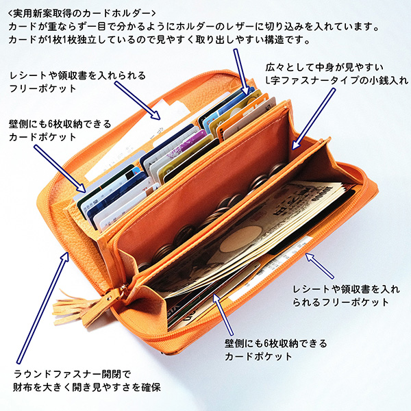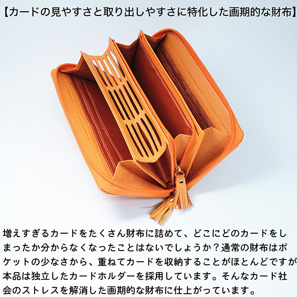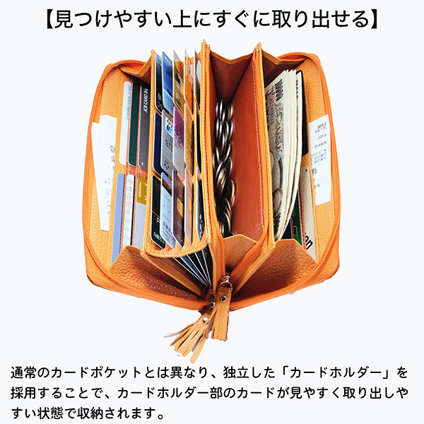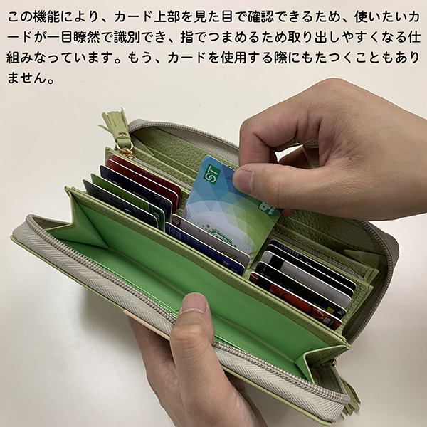 中央のカード入れが扇状に広がる実用新案取得の仕様はカードがパッと見つけやすく取り出しやすいのが特徴です。ファスナー開閉メイン開閉が大きく開き、はっきりカードが見えるので使いたいカードが一目瞭然です。独立しているカードホルダーなので取り出しやすさも抜群。