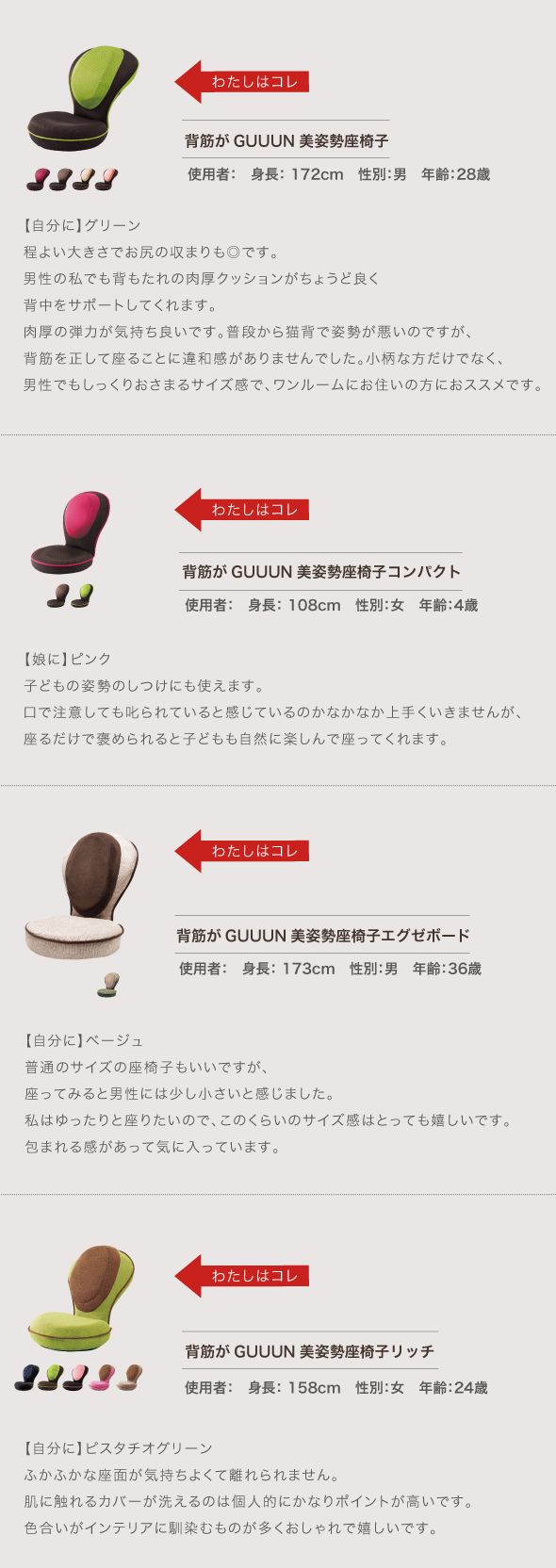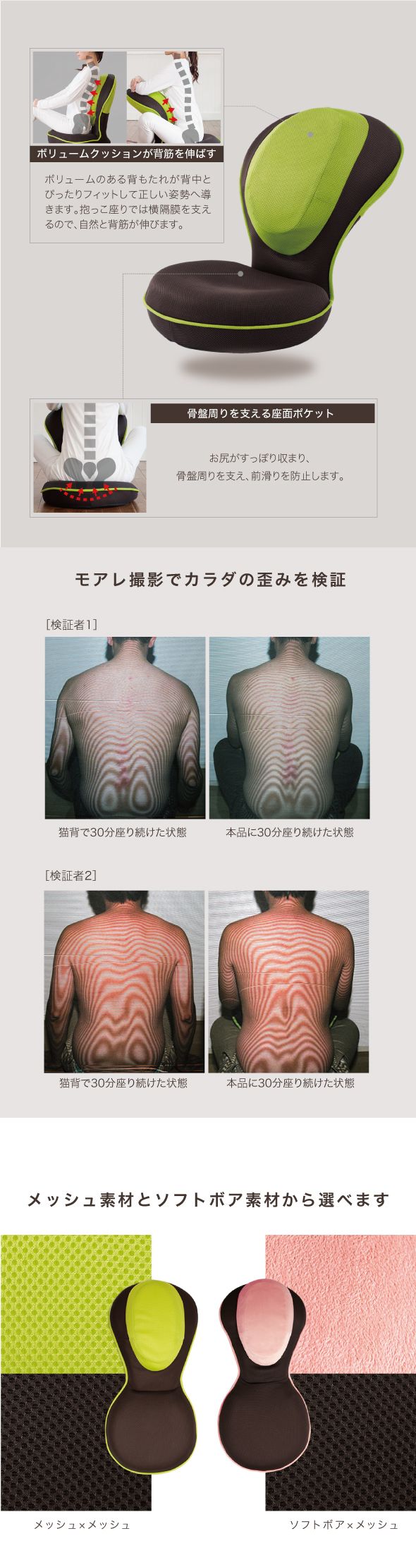 色は5色で背もたれがメッシュの大人ブラウン、ハイセンスなグリーン、深みのあるピンクと、背もたれがモフモフなピンクとベージュです。