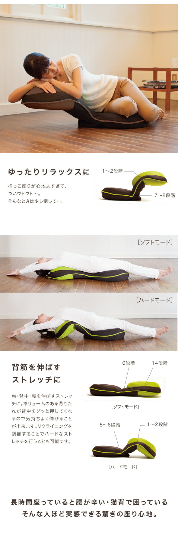 背もたれのリクライニングはもちろん、背中クッションもなんと90度に曲がることで、本商品は2通りの使い方ができます。