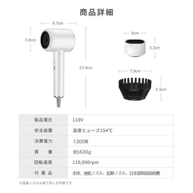 ドライヤー 1300W 速乾 大風量 冷熱風 4段階調節可能 おすすめ ヘアドライヤー マイナスイオン 温度調整 超軽量 高級 美髪 静音 過熱保護