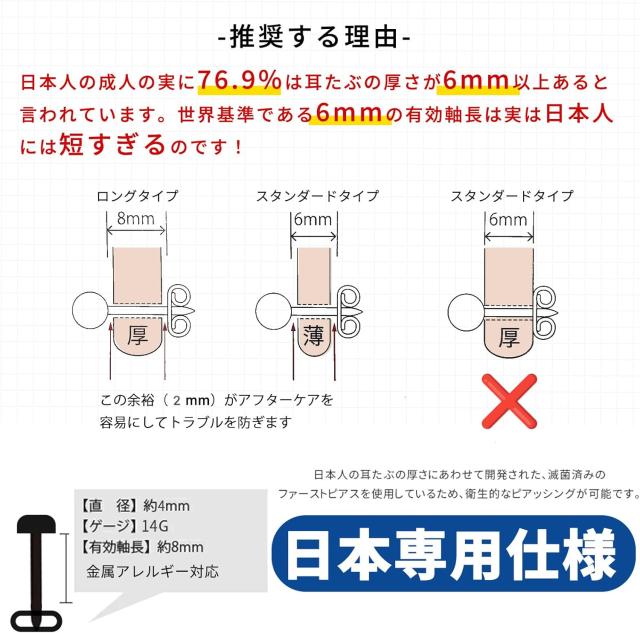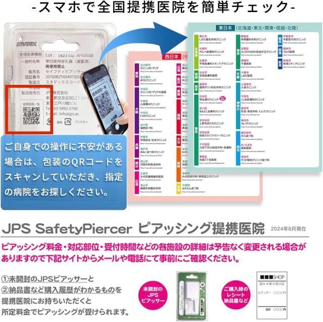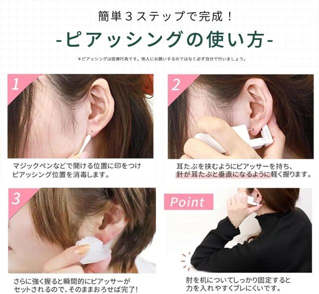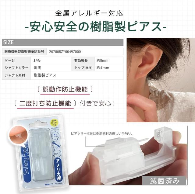 簡単・安全にピアスの穴があけられる、滅菌済ピアス穿孔器 耳たぶセーフティピアッサー 医療用のポリカーボネート製ピアスを使用していますので、ご安心ください。