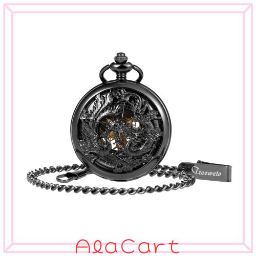 TREEWETO 機械式 スケルトン 懐中時計 ラッキー フェニックス&ドラゴン ホロー ケース チェーン ギフト・ボックス 付き