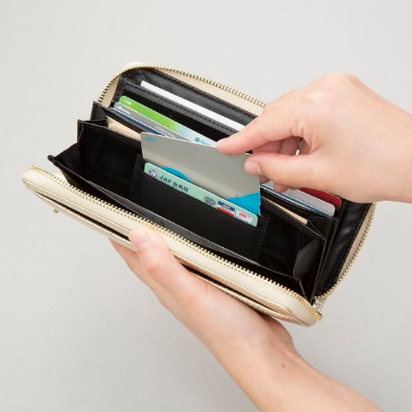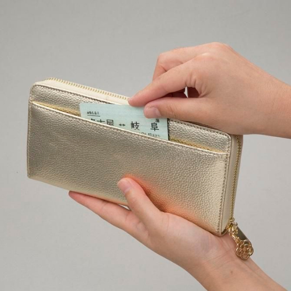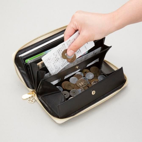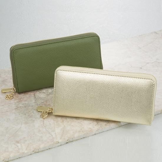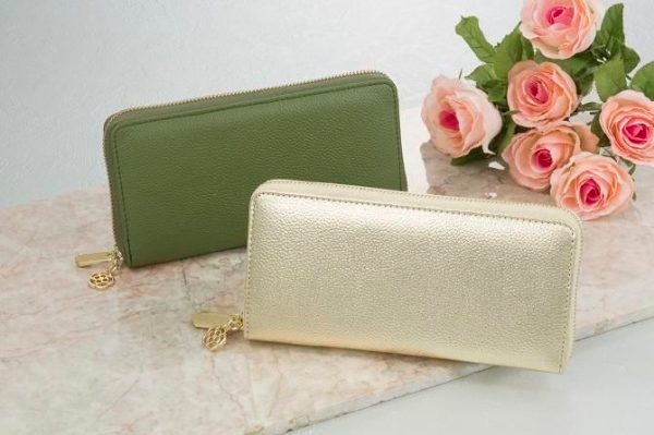 小銭の出し入れのために開発された財布♪レジでお金を払う時に慌てませんか?コインスルータイプの小銭入れを搭載したお財布で、テーブル会計や毎日のレジ前のお支払いがスムーズに!レシートと小銭を、自動で振り分けでき、1ヵ所のお札入れと背面ポケット、2箇所のフリーポケット、大きく開く小銭入れで支払もスムーズ。コンパクトなのに、しっかり収納!がばっと大きく開くので整理整頓がとっても楽ちん♪カラーは2色!おしゃれかつ煌びやかなシャンパンゴールドと深みのある人気のグリーンからお選びいただけます。
