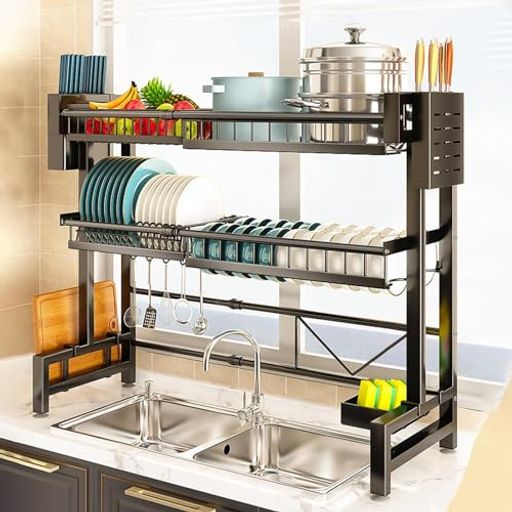水切りラック,水切りラック シンク上食器 2段式水切りかご 台所用品ホルダ キッチン収納棚 大容量 滑り止め 省スペース 箸収納 まな板立て ステンレス製 組み立て簡単調整可能(W62-100CM)