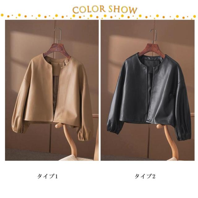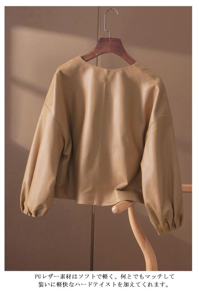春ジャケット レザーアウター 春コーデ バルーン袖 レザージャケット ライトアウター ショート丈 レディース カジュアル おしゃれ フェイクレザー ノーカラージャケット 春 秋 かわいい 大人 女性 無地 シンプル 通勤 ギフト 送料無料