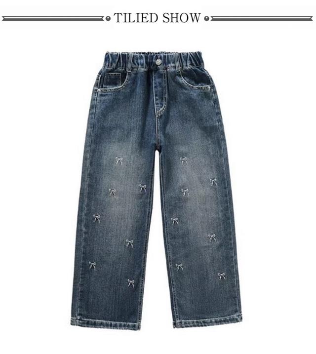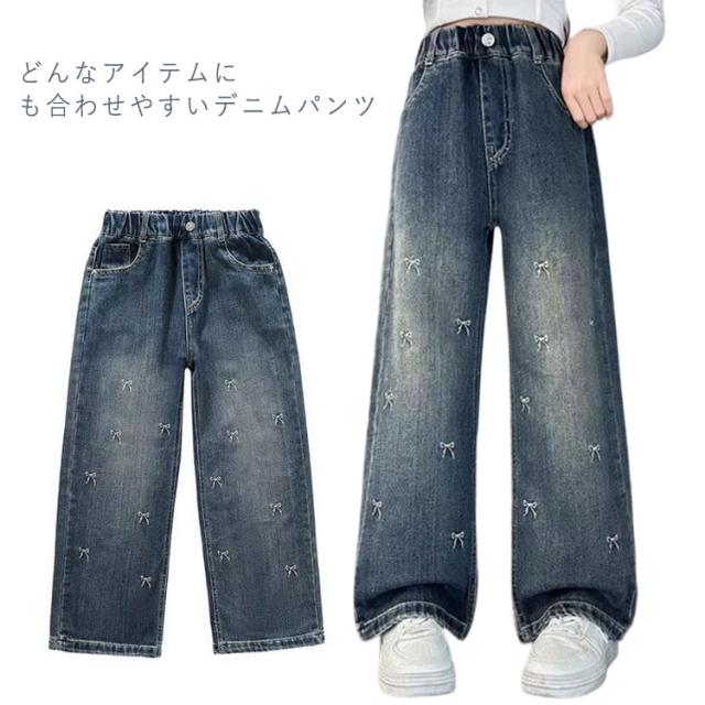 キッズ デニムパンツ 女の子 ジーンズ ワイドパンツ ジーパン 子供服 ボトムス デニム パンツ ロングパンツ 春夏秋 ストレート リボン ウエストゴム 小学生 中学生 発表会 入学式 旅行