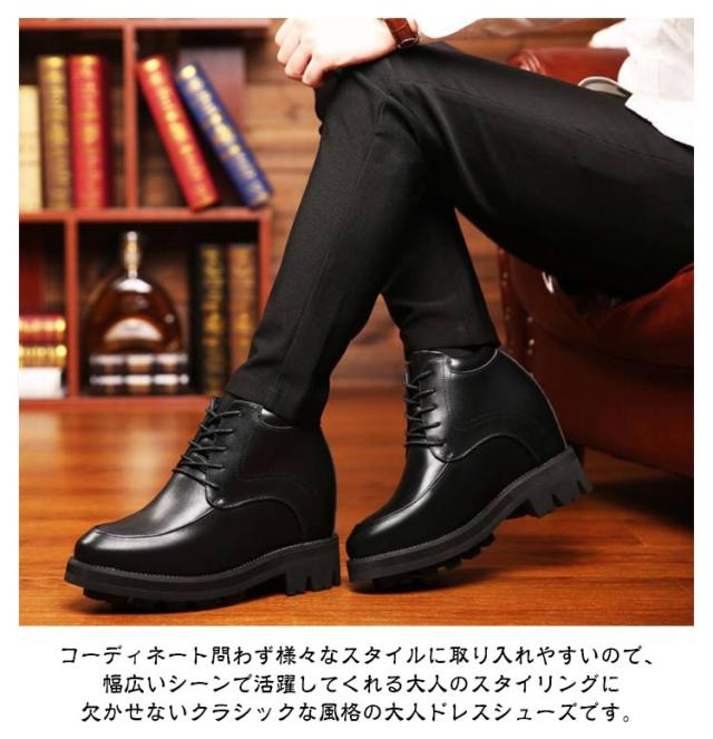 | 16cm/14cm身長アップ!本革のビジネスシューズ!背が高くなるシークレットシューズ。 スーツをカッコよく着こなす脚長スタイルを実現してくれます! ドレスシューズにカジュアルなソールを合わせることで、モードやキレイめ、カジュアル、韓国系と幅広いファッショに合わせやすい表情に。 すっきりとしたシルエットでミニマルなアッパーと、無骨な厚底ソールのミスマッチが足元に存在感をプラスしてくれる。 衝撃吸収のインソールと、軽量で履き心地がよく歩きやすいので、タウンユースは勿論、カジュアルシーン、旅行などにも最適! コーディネート問わず様々なスタイルに取り入れやすいので、幅広いシーンで活躍してくれる大人のスタイリングに欠かせないクラシックな風格の大人ドレスシューズです。 | |