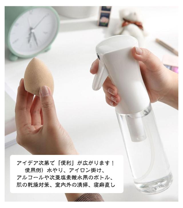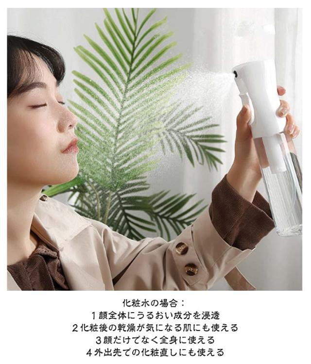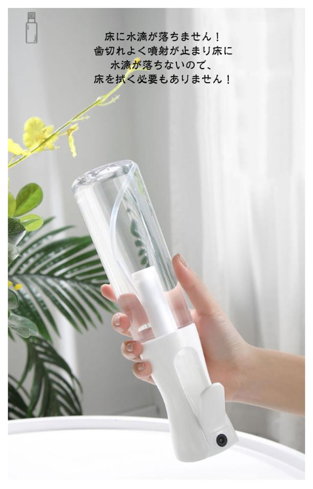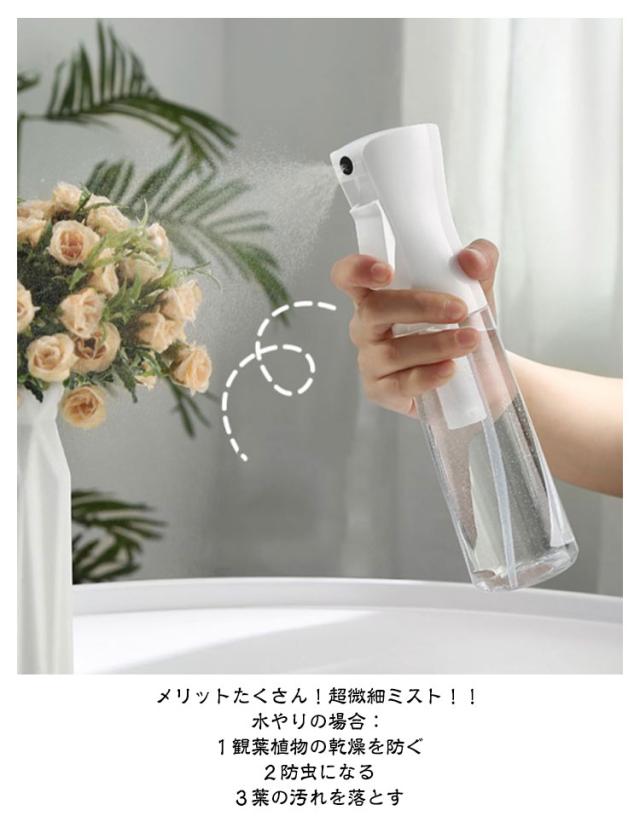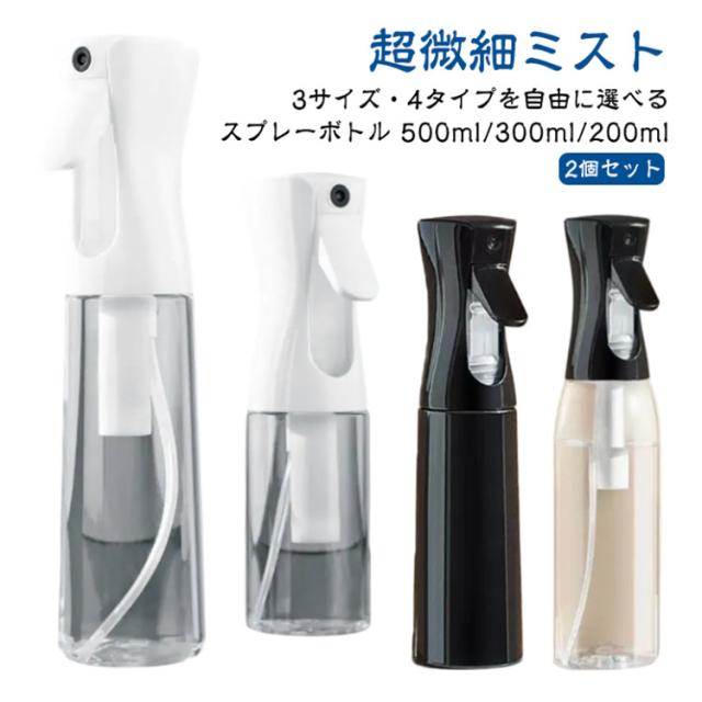 | 超微細ミスト スプレーボトル 500ml/300ml/200ml 3サイズ・4タイプを自由に選べる【2個セット】 ●POINT 1 とにかくミストがキメ細かい! 約30ミクロンの超キメ細かいミストの噴霧を実現! ミストがキメ細かいとメリットたくさん! メリットたくさん!超微細ミスト!! 水やりの場合: 1観葉植物の乾燥を防ぐ 2防虫になる 3葉の汚れを落とす 化粧水の場合: 1顔全体にうるおい成分を浸透 2化粧後の乾燥が気になる肌にも使える 3顔だけでなく全身に使える 4外出先での化粧直しにも使える ●POINT 2 ワンプッシュで超大量噴射! 特殊加工でワンプッシュで約2秒間(2.5cc)の大量噴射を実現! 5回連続のプッシュで約10秒間連続でミストが噴射できます! ●POINT 3 部屋にも馴染むシンプルデザイン 日常のあらゆる場面で使用できるよう、インテリアにも馴染むデザインを採用しました! ●POINT 4 床に水滴が落ちません! 歯切れよく噴射が止まり床に水滴が落ちないので、床を拭く必要もありません! ●POINT 5 アイデア次第で「便利」が広がります! 使用例)水やり、アイロン掛け、アルコールや次亜塩素酸水用のボトル、肌の乾燥対策、室内外の清掃、寝癖直し 360°噴射できます! 横向きはもちろん逆さまでも問題なく噴射できて使い勝手抜群です! | |