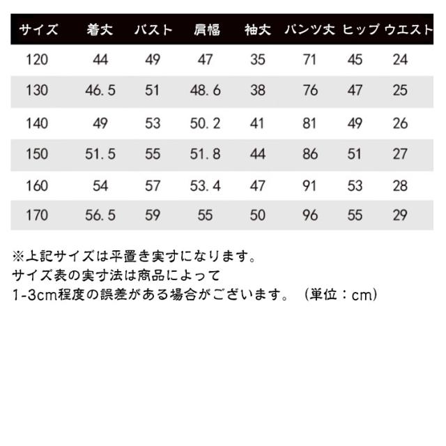 | サイズについての説明 | セット内容:アウター&ロングパンツ(女の子用ジャージ上下セットです。) ※上記サイズは平置き実寸になります。 サイズ表の実寸法は商品によって1-3cm程度の誤差がある場合がございます。(単位:cm) |
