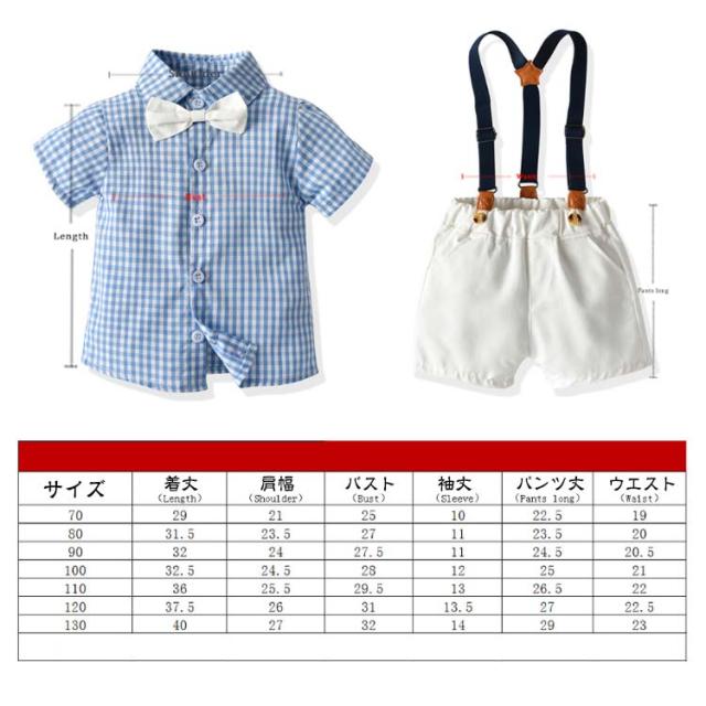 | サイズについての説明 | 【商品セット】 男の子:シャツ+パンツ+サスペンダー+リボン / 女の子:ワンピース+帽子 ※上記サイズは平置き実寸になります。 サイズ表の実寸法は商品によって1-3cm程度の誤差がある場合がございます。(単位:cm) |