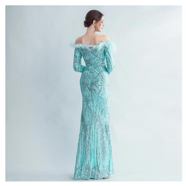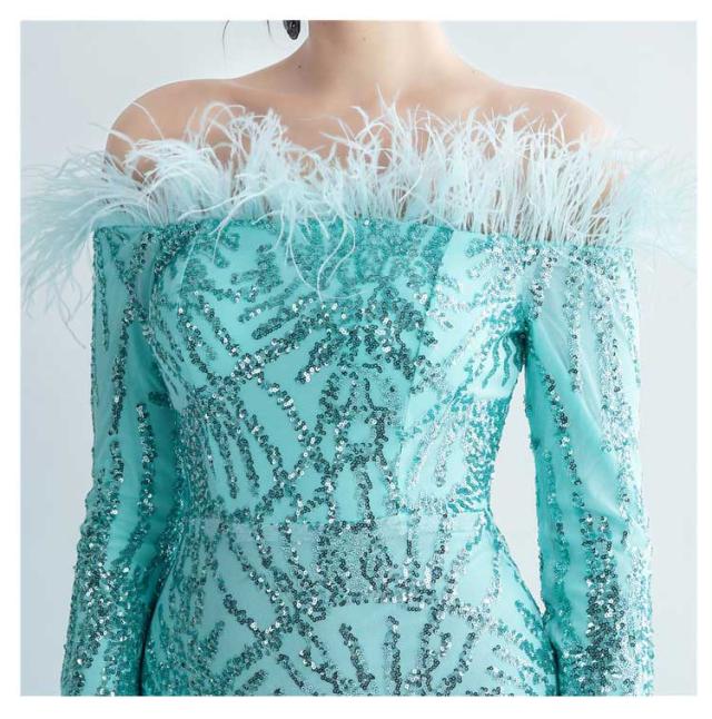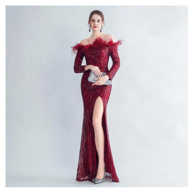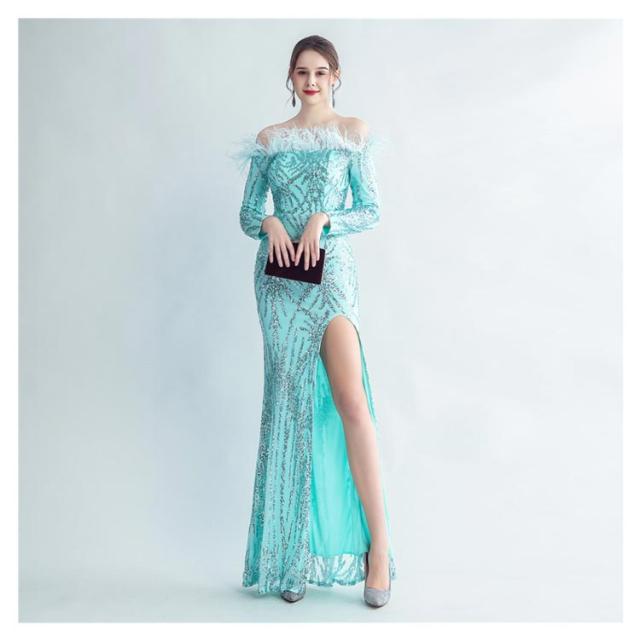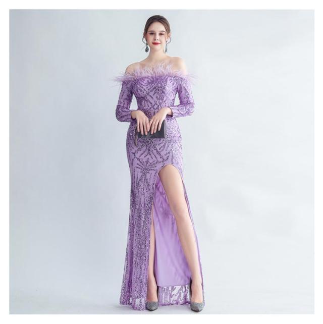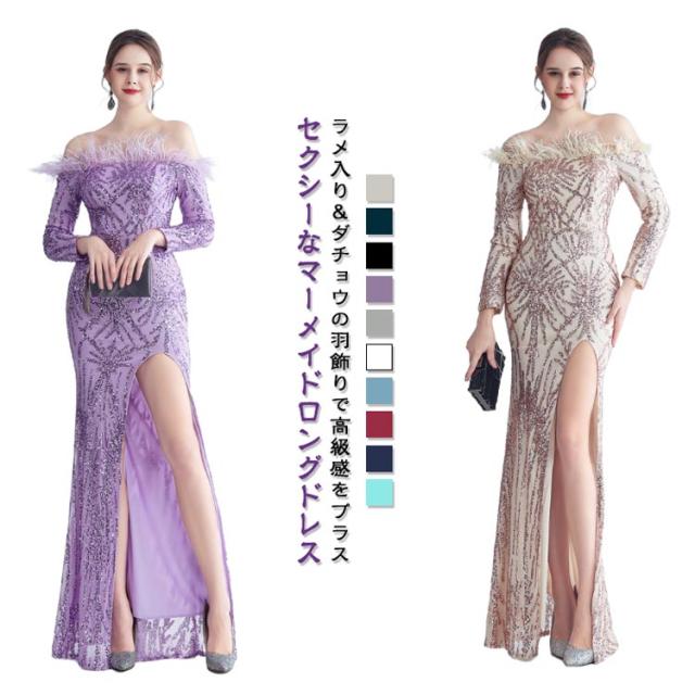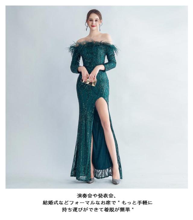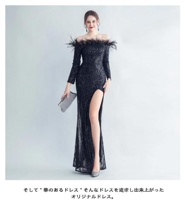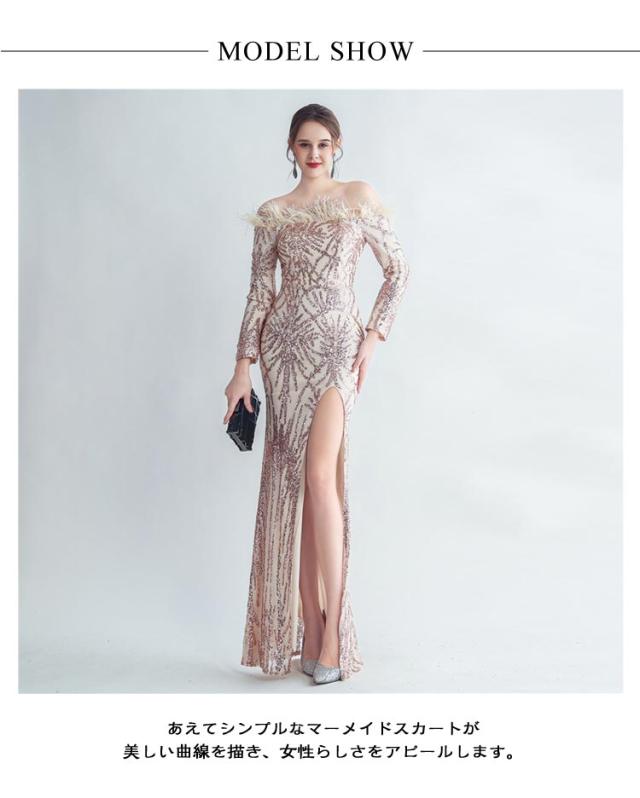 ファー付き ワンピース パーティドレス タイト ロングドレス ウェディングドレス オフショルダー 長袖 スパンコール マーメイドドレス 二次会 スリット ワンピース 結婚式 キラキラ 花嫁 お呼ばれドレス 成人式ドレス フォーマル ステージ衣装 発表会 演奏会
