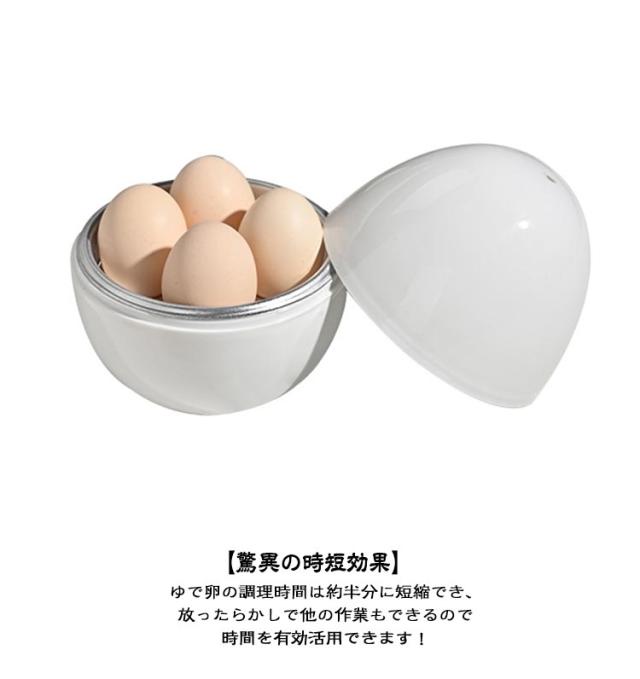 | レンジで楽チン 時短&片手間OK 最大4個調理 ゆで卵メーカー 選べる5種類 こんなお悩みありませんか? ・時間がかかる ・鍋で作るのが面倒 ・殻剥きで失敗する ・好みの固さにできない お任せください! 当店のゆで卵メーカーで全て解決できます! ゆで卵メーカーのおすすめポイント! 【レンジでチンするだけ】 レンジでチンするだけで理想のゆで卵が簡単に作れます。 料理が苦手な方や小さなお子様でも安心してご使用できます。 電子レンジで調理するのでガスコンロが1口空くので、もう1品同時並行で料理ができて便利です! 【とろとろ・半熟・固茹で自由自在】 レンジの調理時間を調節するだけでご自身の理想的なゆで卵の固さで仕上がります! ※電子レンジを中強火に設定し、半熟の場合は約 7 分、固茹の場合は約 5 分加熱します (卵を回転させすぎると爆発するので注意してください)。 【驚異の時短効果】 ゆで卵の調理時間は約半分に短縮でき、放ったらかしで他の作業もできるので時間を有効活用できます! 【最大4個まで調理可能】 一度に最大4個まで調理ができるので、朝の忙しい時もとても便利です! ご存知ですか?? 卵は加熱をするとその時点から劣化が始まってしまうので、生卵よりもかなり日持ちが短くなります。 当店のゆで卵メーカーを使用すれば食べたい時にすぐに作れて、毎日作りたてが食べられるので栄養・衛生的にも安全・安心です! | |