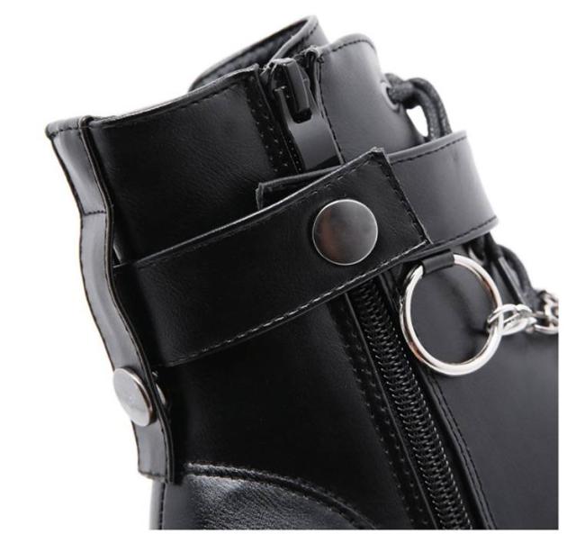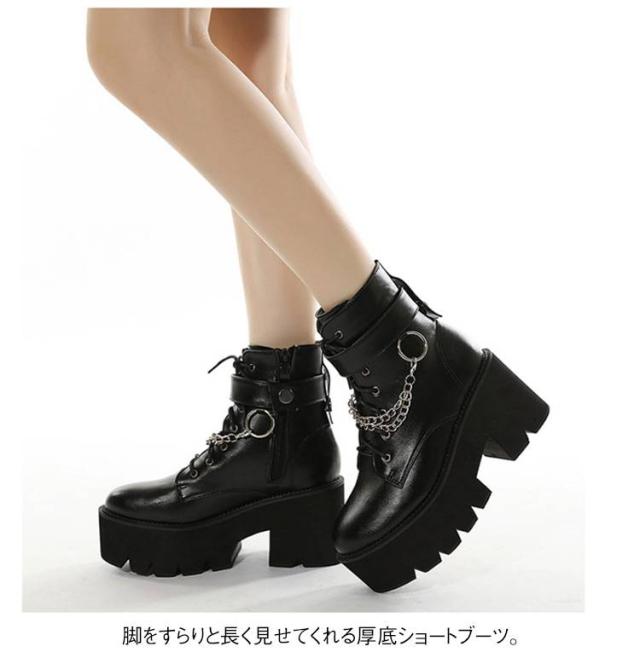 厚底靴 ブーツ ショートブーツ ヒール8cm 厚底ブーツ ゴスロリ Uレザー Pチェーン付き 厚底 プラットフォーム レディース ハイヒール 前厚 チャンキーヒール 秋冬 黒 美脚 モード系 厚底靴 ロリータ キャバ