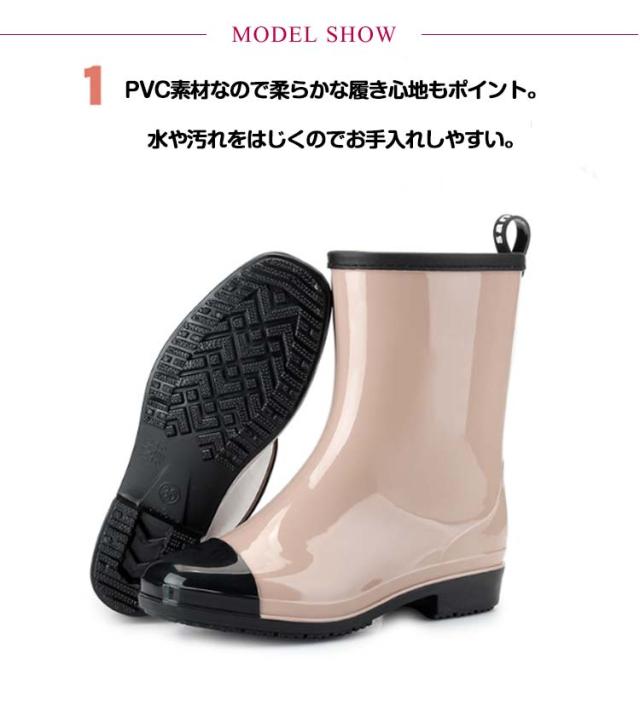 | 雨・晴れ兼用!お洒落なバイカラーのレインブーツ すっきりとしたシルエットでどんなスタイルでも合わせやすい! PVC素材なので柔らかな履き心地もポイント。水や汚れをはじくのでお手入れしやすい。 凹凸があり滑りにくいソールを使用しているため、雨の日も安心して履いていただけます。 ヒールも歩きやすい3cm、高すぎない低すぎない絶妙なローヒールで疲れにくく歩きやすさも抜群です。 雨が止んでもおしゃれに履いていられます。 | |