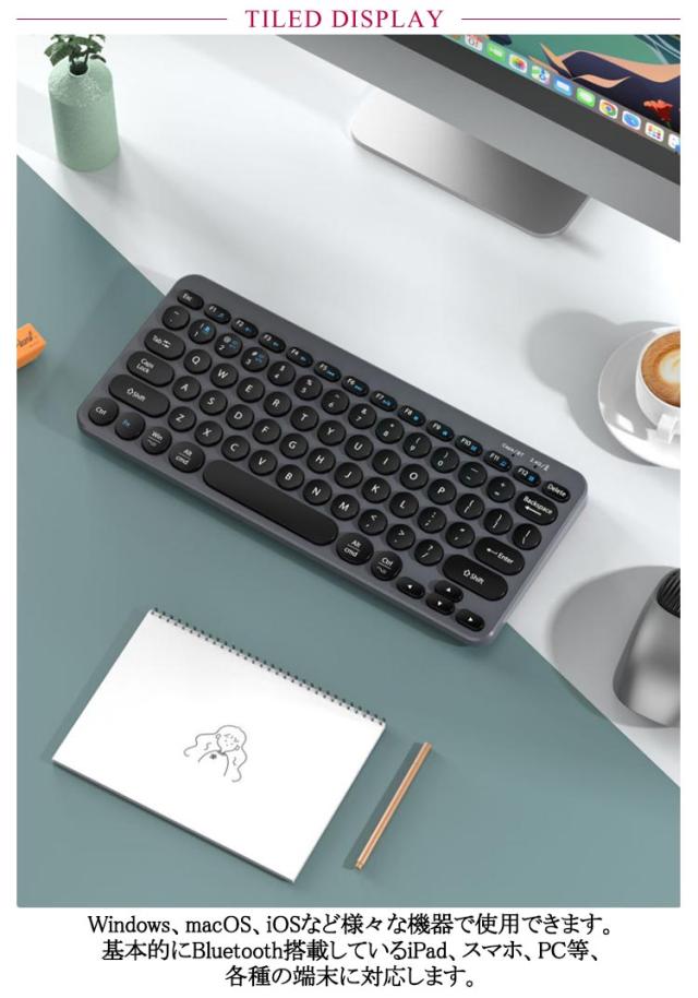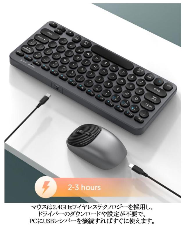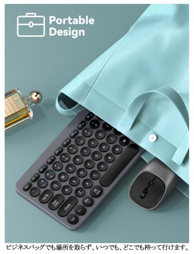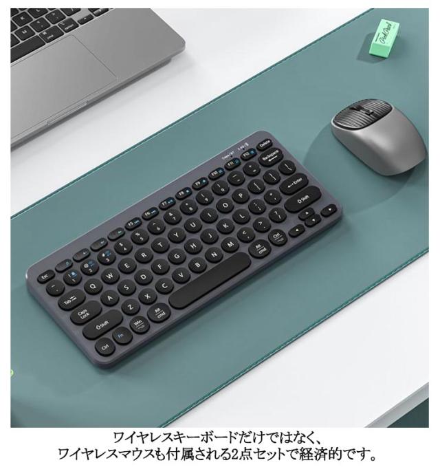 | 丸いキーがかわいいキーボード&マウスセット。 ワイヤレスキーボードだけではなく、ワイヤレスマウスも付属される2点セットで経済的です。 どのボタンでもバランスがよく、快適で、静かなクリックができます。 Windows、macOS、iOSなど様々な機器で使用できます。基本的にBluetooth搭載しているiPad、スマホ、PC等、各種の端末に対応します。 キーボードはパソコンやスマートフォンなど、Bluetoothを内蔵した機器とレシーバーなしで接続できます。 マウスは2.4GHzワイヤレステクノロジーを採用し、ドライバーのダウンロードや設定が不要で、PCにUSBレシバーを接続すればすぐに使えます。 最大10Mまで通信できるので、距離や位置に気にせず自由自在に移動できます。 ビジネスバッグでも場所を取らず、いつでも、どこでも持って行けます。 | |