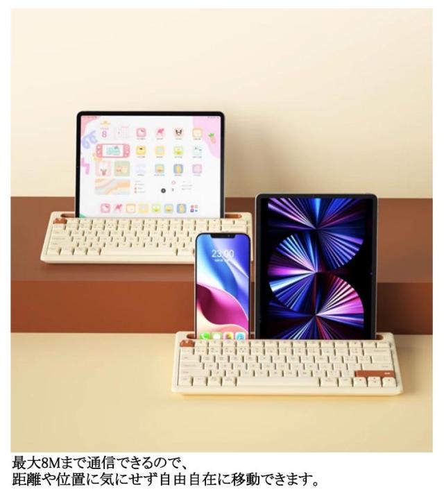 | スマホ/iPad/タブレットスタンド付きのキーボード。【Bluetooth&2.4GHzレシバー2way】 Windows、Android、macOS、iOSなど様々な機器で使用できます。基本的にBluetooth搭載しているiPad、スマホ、PC等、各種の端末に対応します。 キーボードはパソコンやスマートフォンなど、Bluetoothを内蔵した機器とレシーバーなしで接続できます。 また2.4GHzワイヤレステクノロジーを採用し、ドライバーのダウンロードや設定が不要で、PCにUSBレシバーを接続すればすぐに使えます。 マルチペアリング対応で3台の機器を切り替えて使える。 最大8Mまで通信できるので、距離や位置に気にせず自由自在に移動できます。 | |