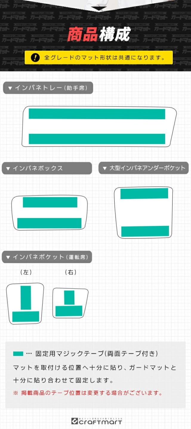 | 商品構成 | インパネトレー(助手席)用ガードマット 1枚 インパネボックス用ガードマット 1枚 大型インパネアンダーポケット用ガードマット 1枚 インパネポケット(運転席)用ガードマット 2枚 |
