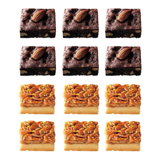しっとり焼いた、ほろ苦い大人の濃厚ブラウニーと、キャラメリゼしたたっぷりのアーモンドスライスをクッキー生地に重ねた香ばしいフロランタンです。ブラウニー×6、フロランタン×6
