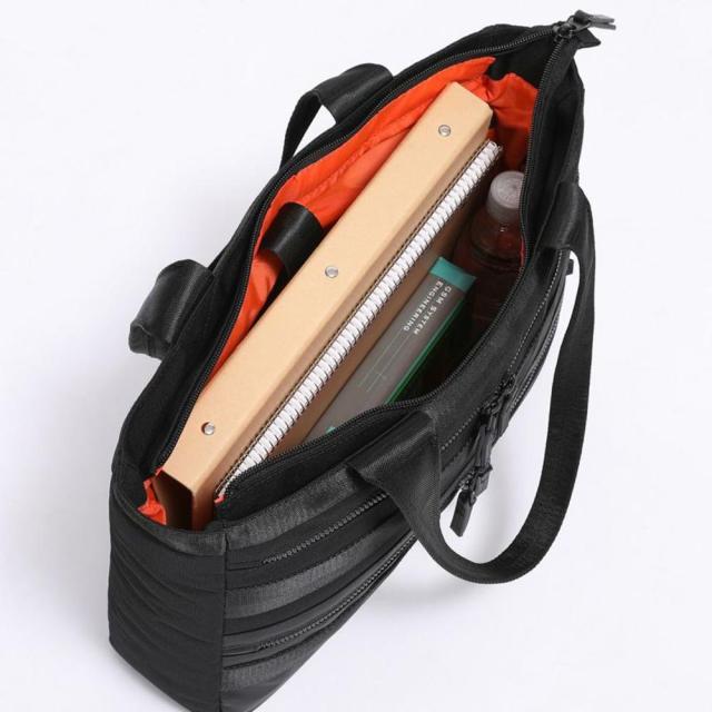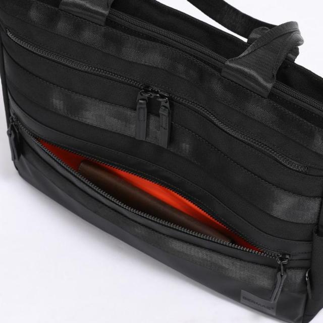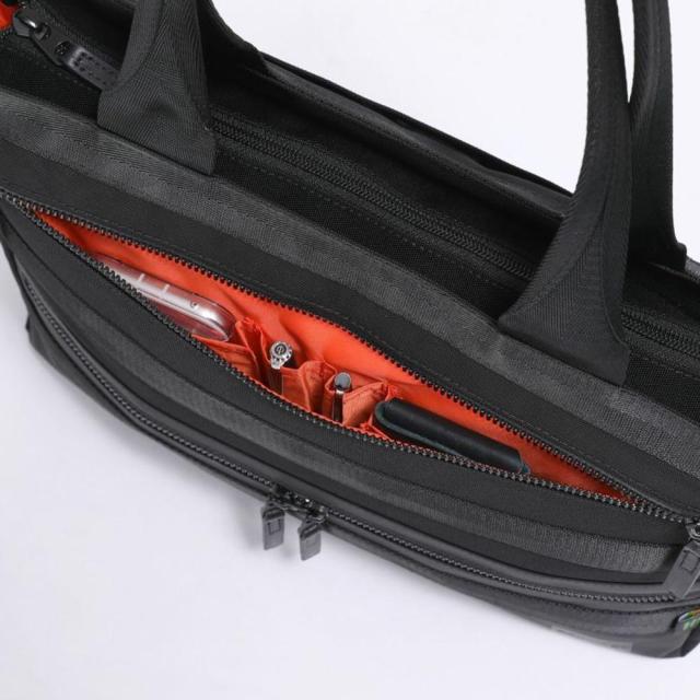 メインルームは視認性のよいオレンジの生地を用い、小物の収納に便利なマルチポケットレイアウトでビジネス書類やPCなど効率のよい収納が実現します。メインルームの前面側は一番奥に横幅いっぱいの広々としたファスナーポケットを配置しました。