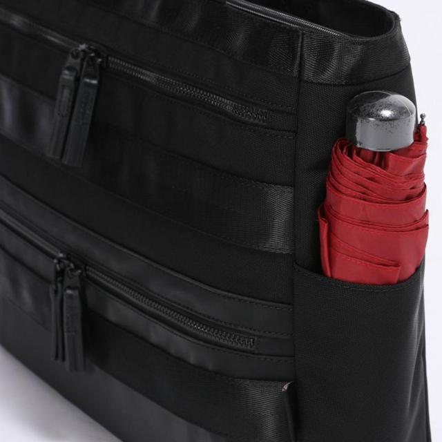 左側のサイドにはオープンポケットを備え、すぐに出し入れしやすく折りたたみ傘などの収納に便利です。背面上部にもポケットを配置。ベルクロ着脱でさっと取り出したいものを入れるのに便利です。