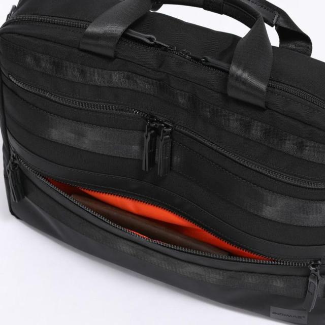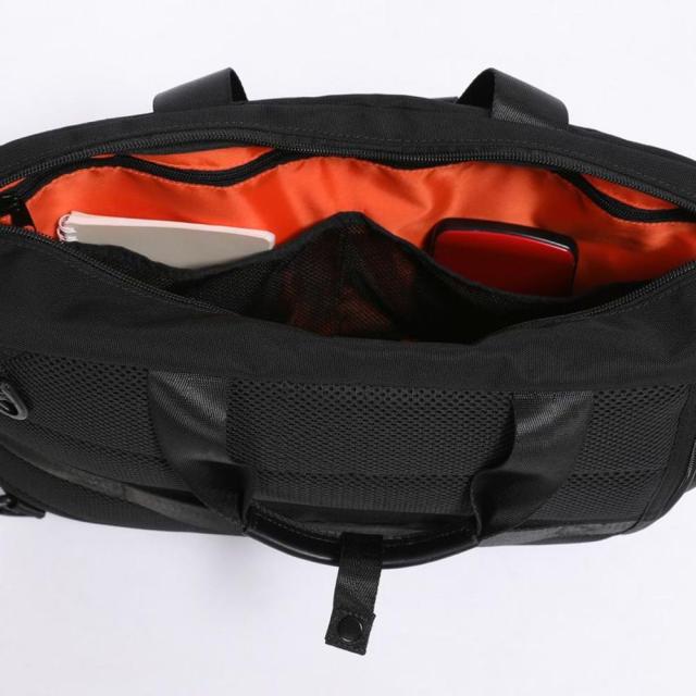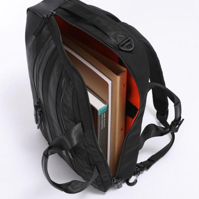 メインルームは視認性のよいオレンジの生地を用い、小物の収納に便利なマルチポケットレイアウトでビジネス書類やPCなど効率のよい収納が実現します。メインルームは開口部が2方向(L字型)に大きく開くので、内容物が確認しやすく出し入れもスムーズです。