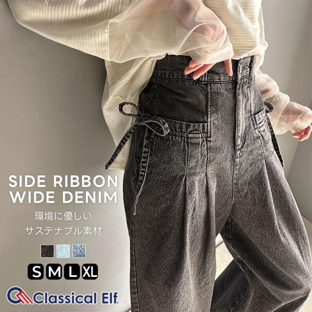 クラシカルエルフ春新作 ボトムス パンツ レディース 綿100% デニム素材 イージーパンツ ワイドパンツ デニムパンツ ワイド サイドリボン タック ウエスト後ろゴム サステナブル シンプル カジュアル ユーズド感 お洒落 大きいサイズ 2026ss ce1260371