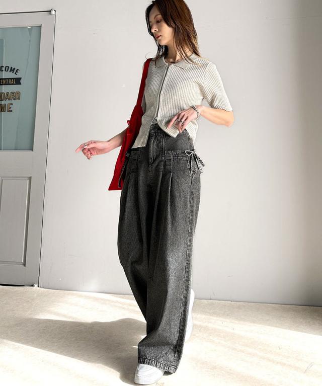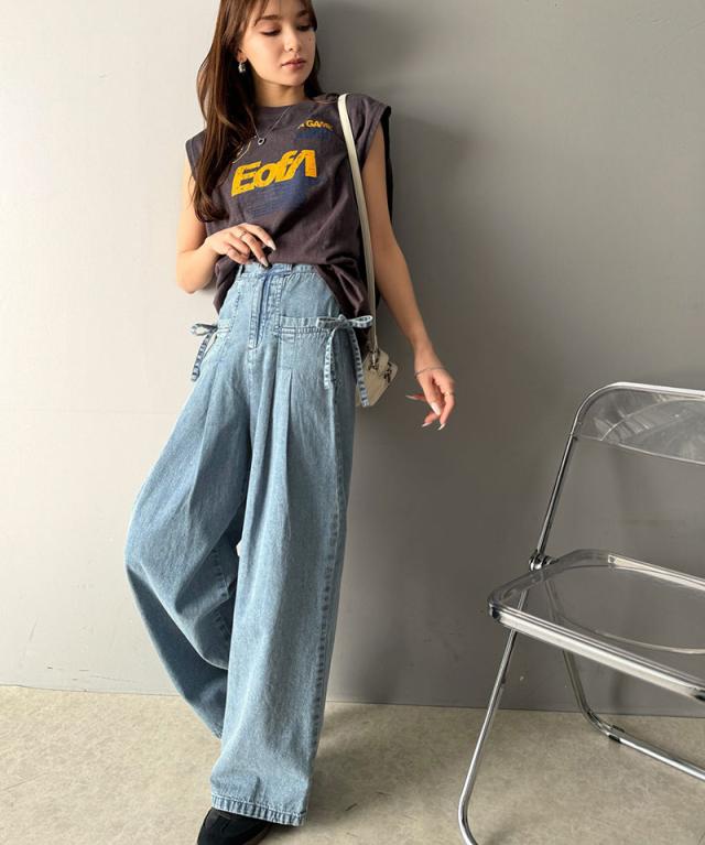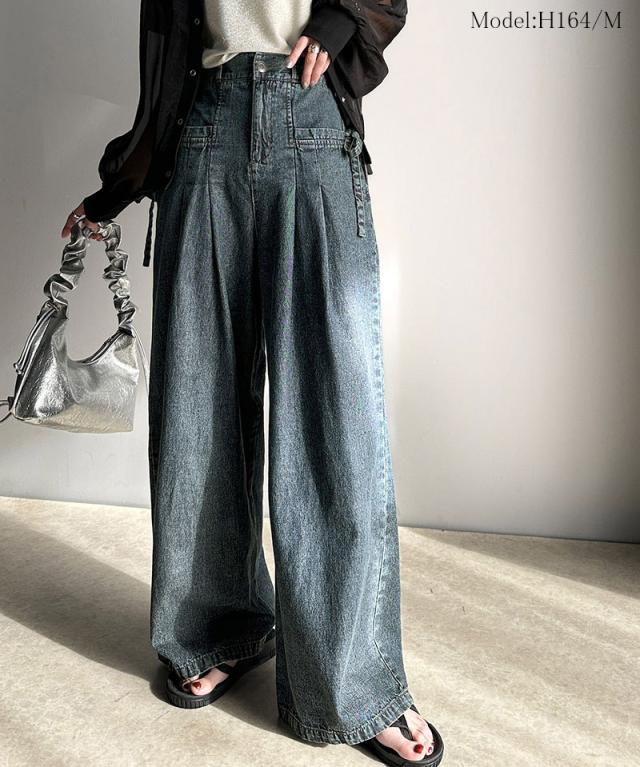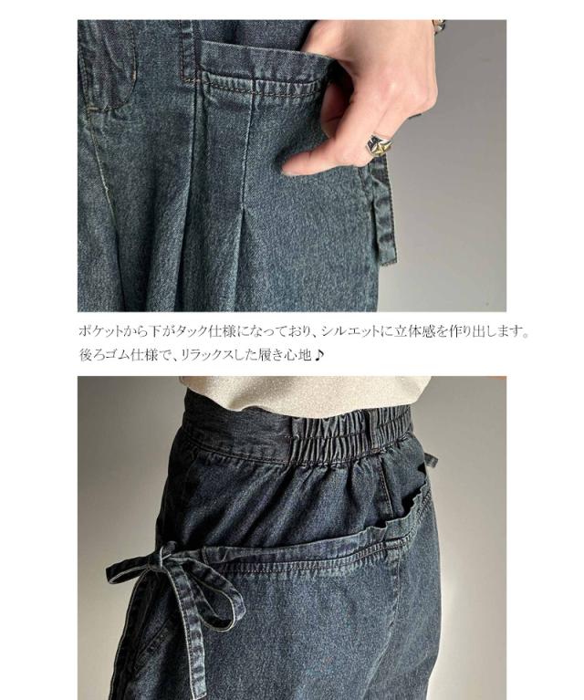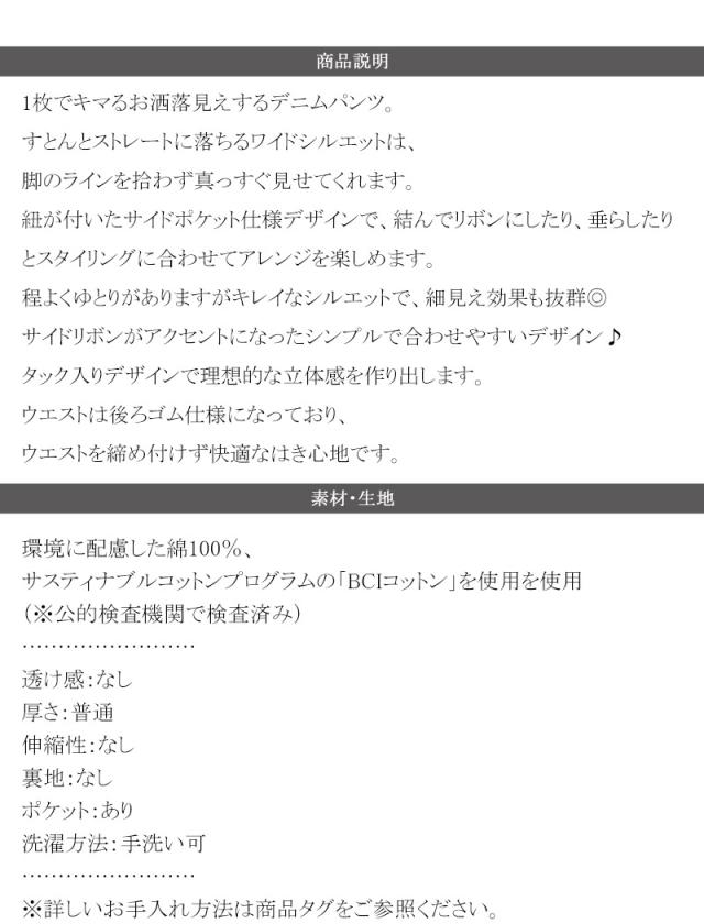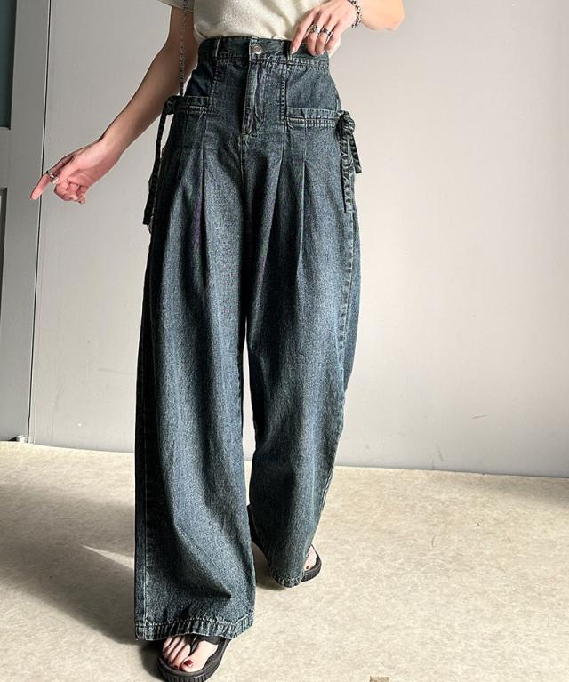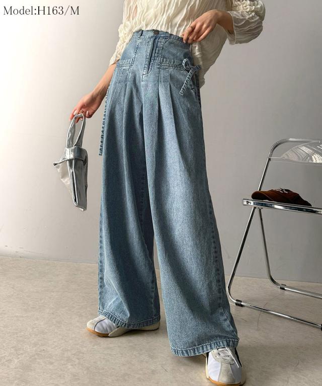 ★環境に優しいサステナブル素材。綿100%デニム素材サイドリボンタックワイドパンツ★