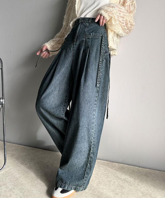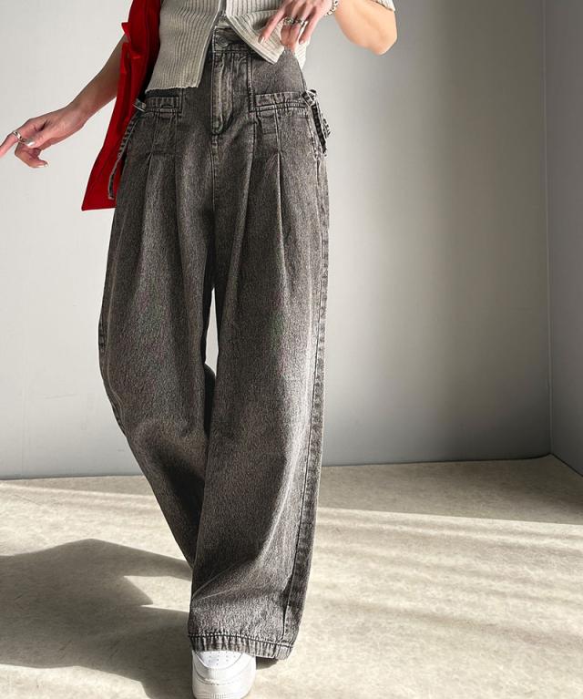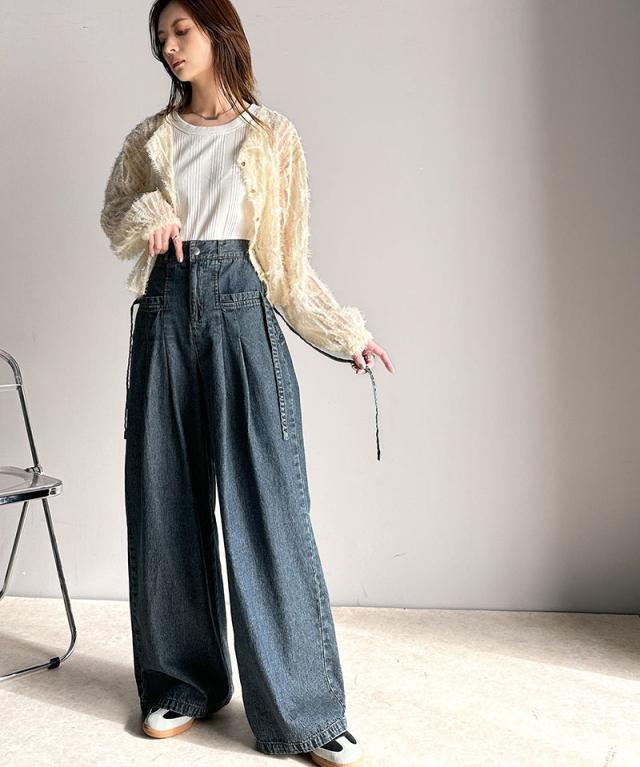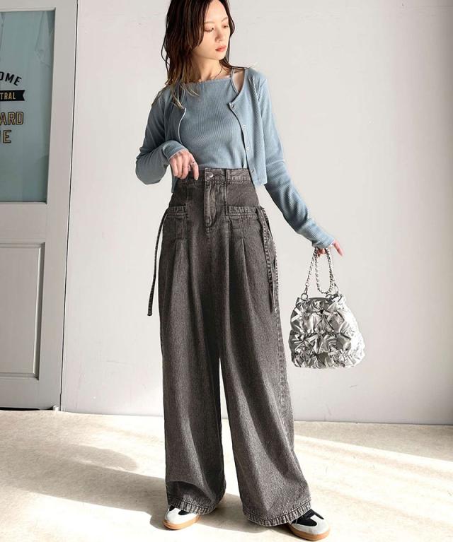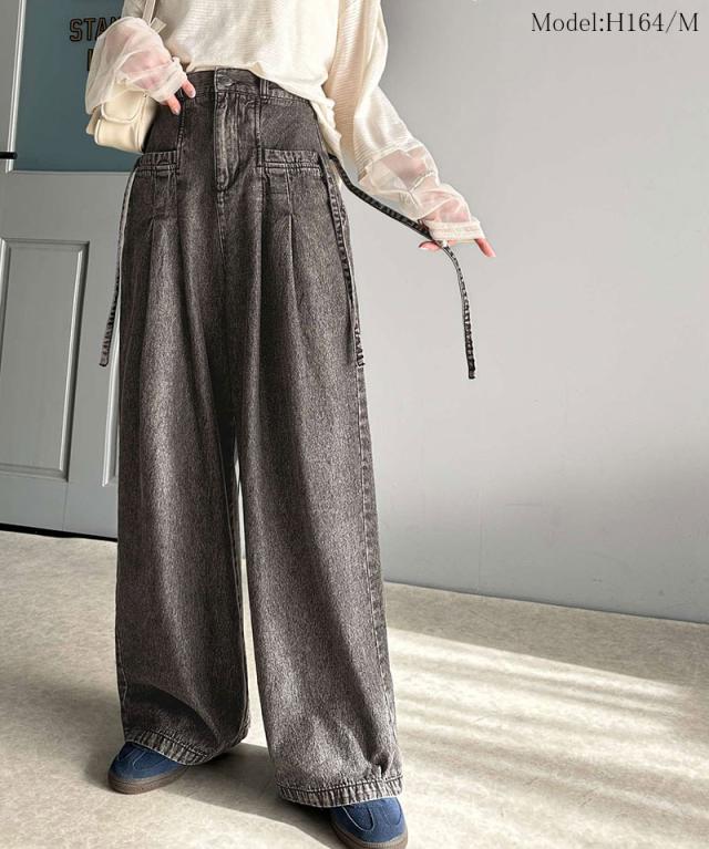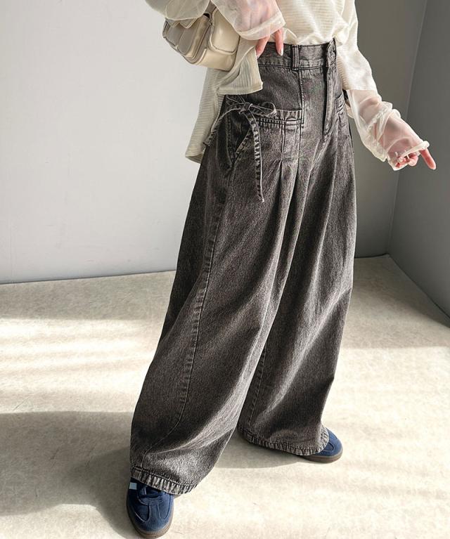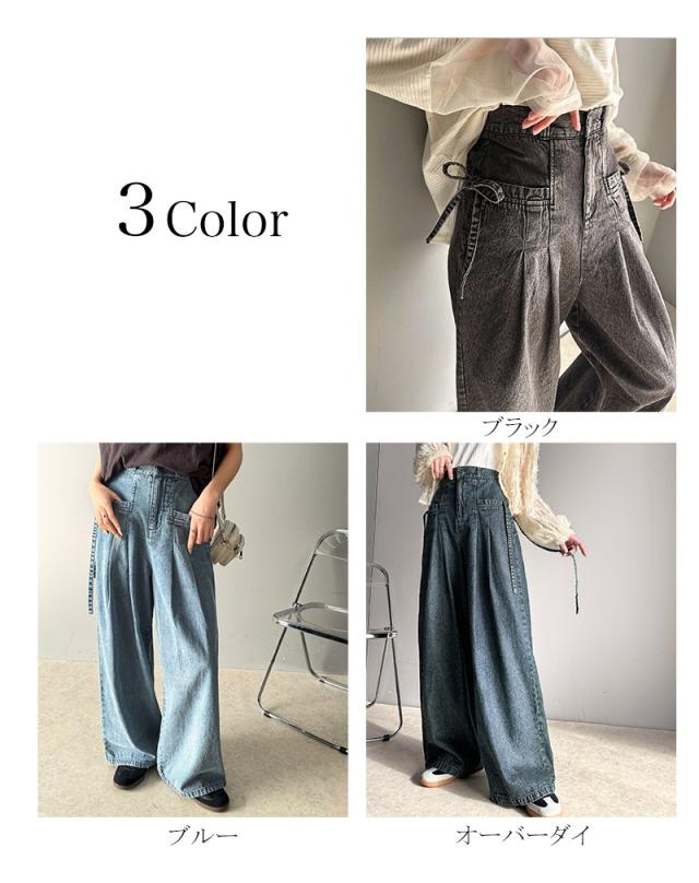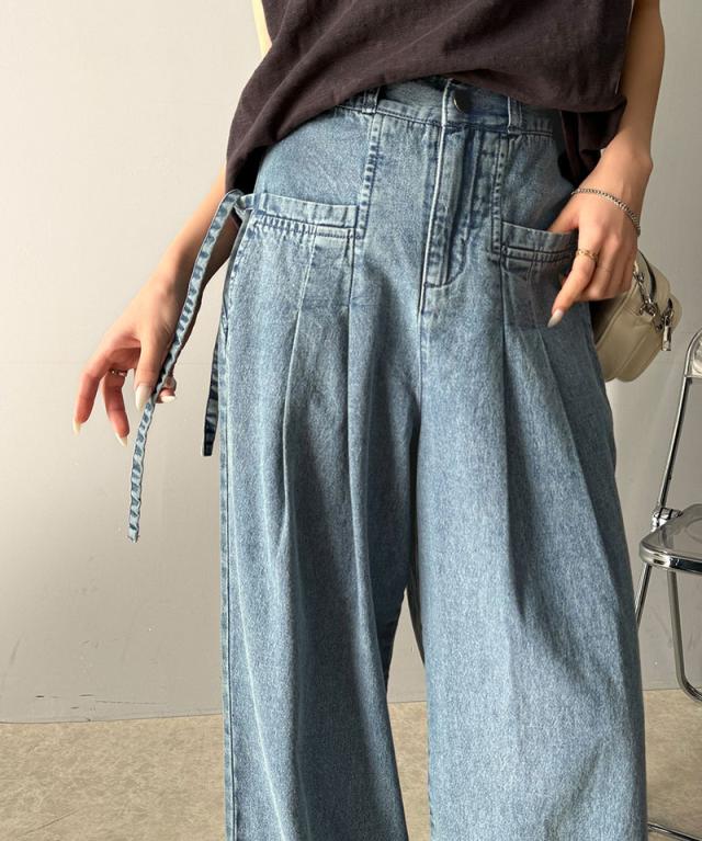 ★環境に優しいサステナブル素材。綿100%デニム素材サイドリボンタックワイドパンツ★