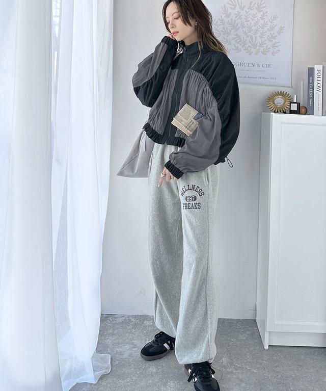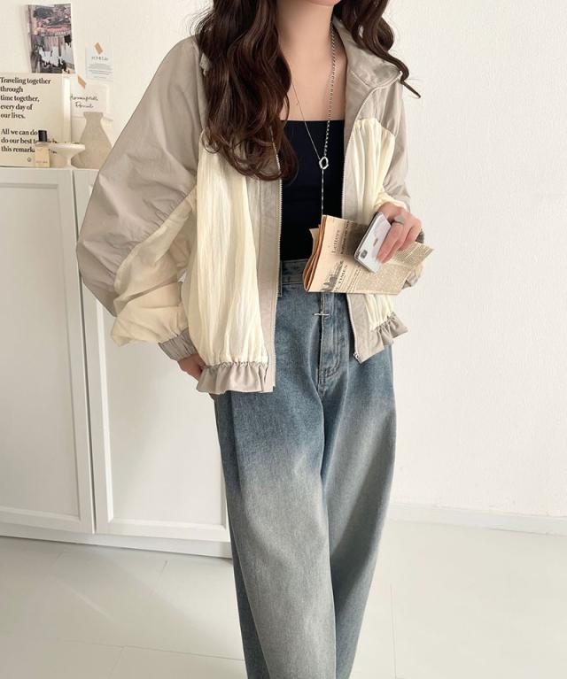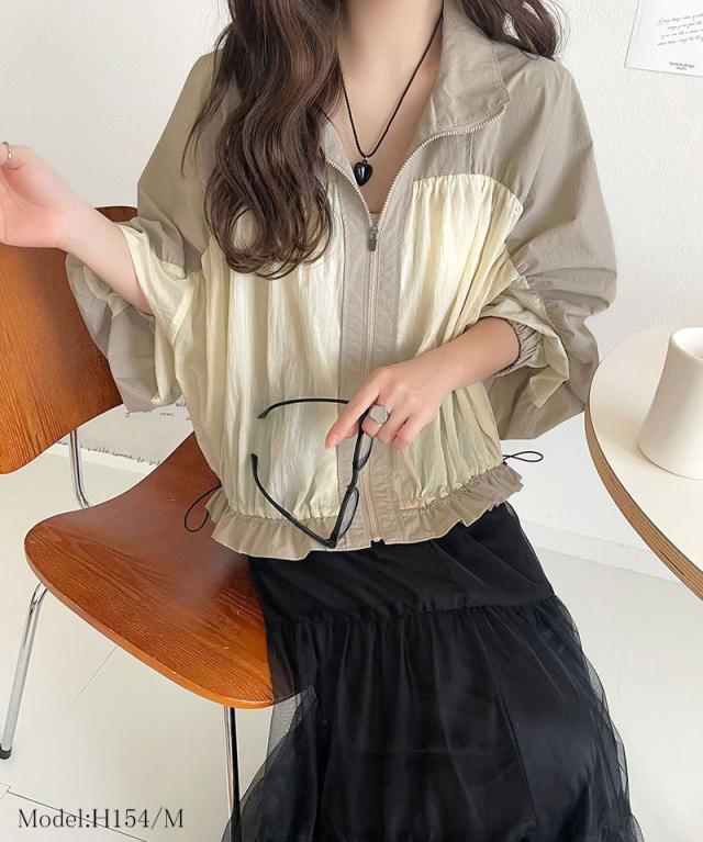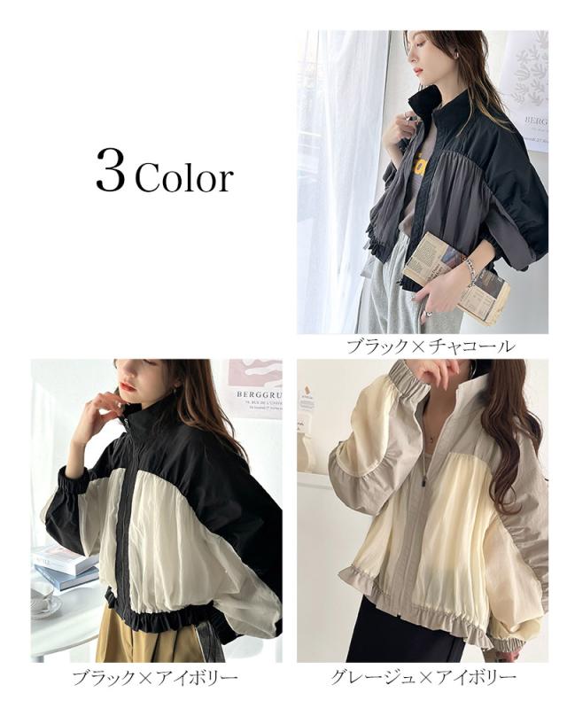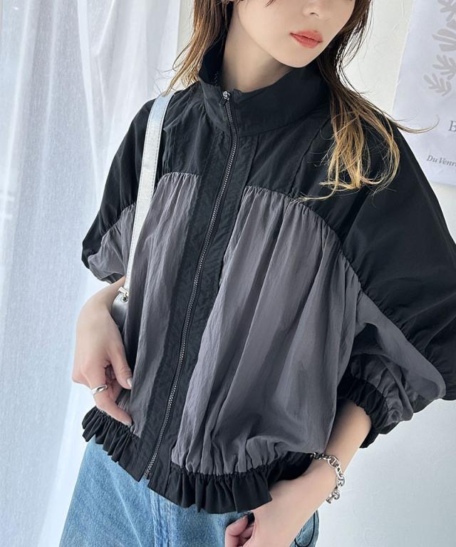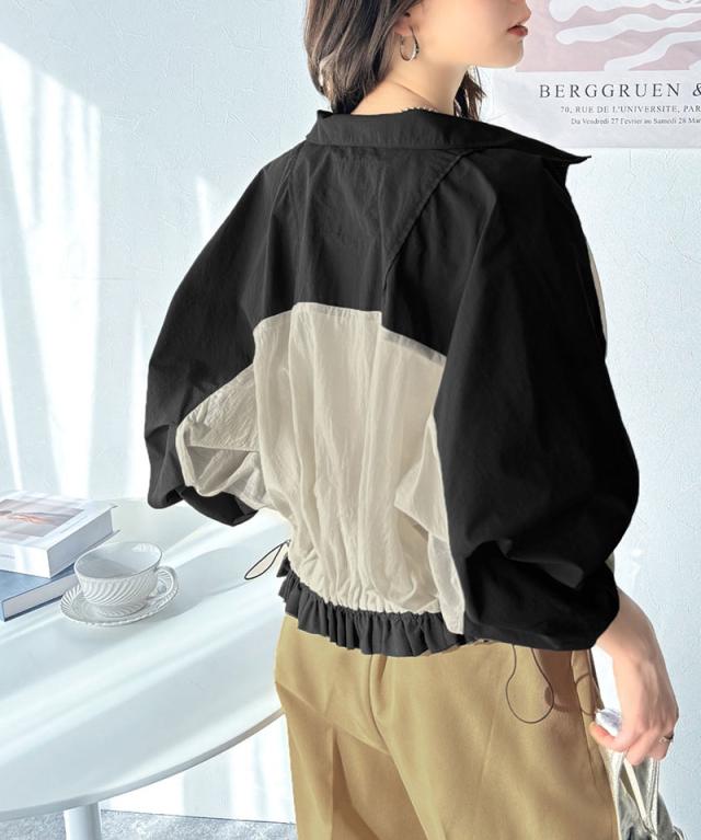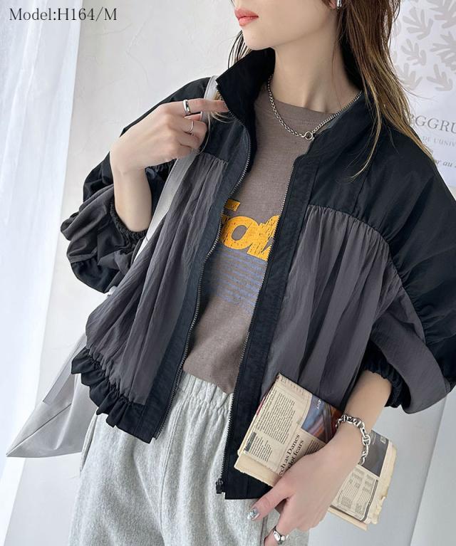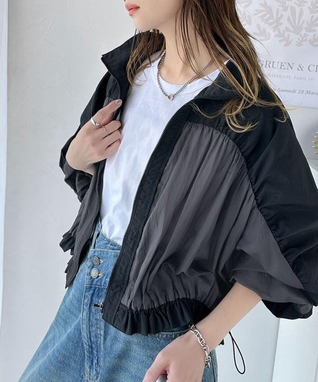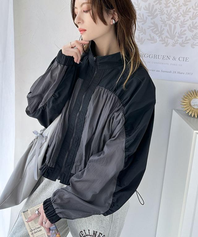 ★柔らかなシアーが魅力。軽量ナイロン異素材ドッキングギャザー使いスタンドカラーブルゾン★