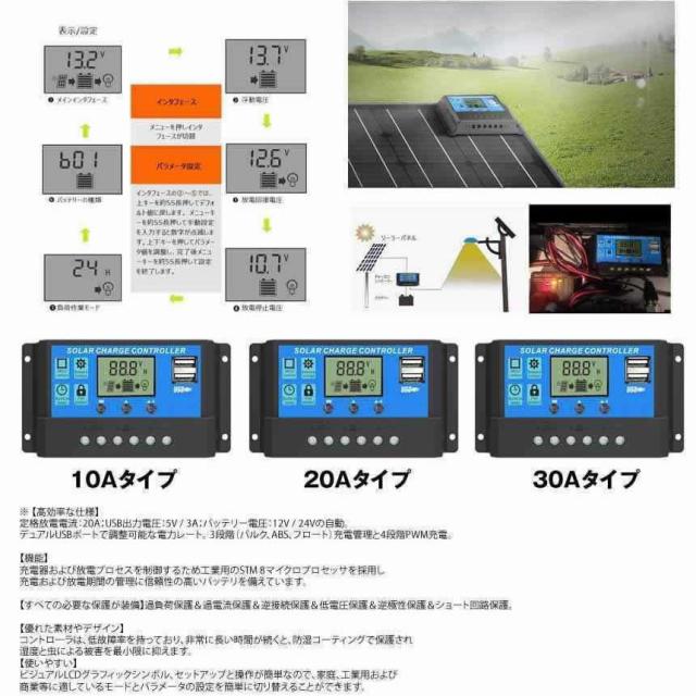 ソーラーチャージコントローラー 30A 12V/24V LCD 鉛蓄電池 車 バッテリー 充電コントローラー USBポート 2口 電流ディスプレイ 液晶 CHARCON-20 mg0307-45a