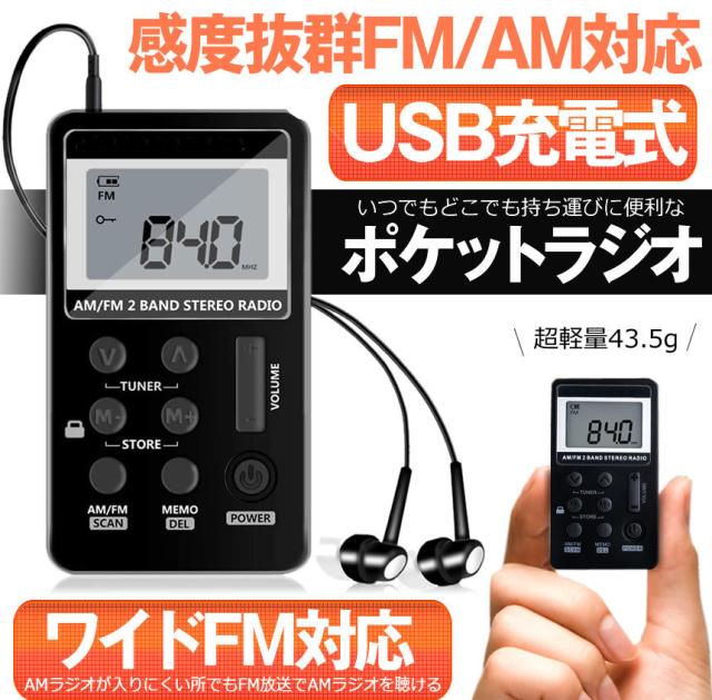 ポケットラジオ 充電式 小型 USB AM FM ワイドFM対応 メモリー機能 ロック機能 軽量 ポータブルラジオ 携帯 通勤 旅行 防災 ミニラジオ 携帯ラジオ POKERAJI m-mi0703-11a