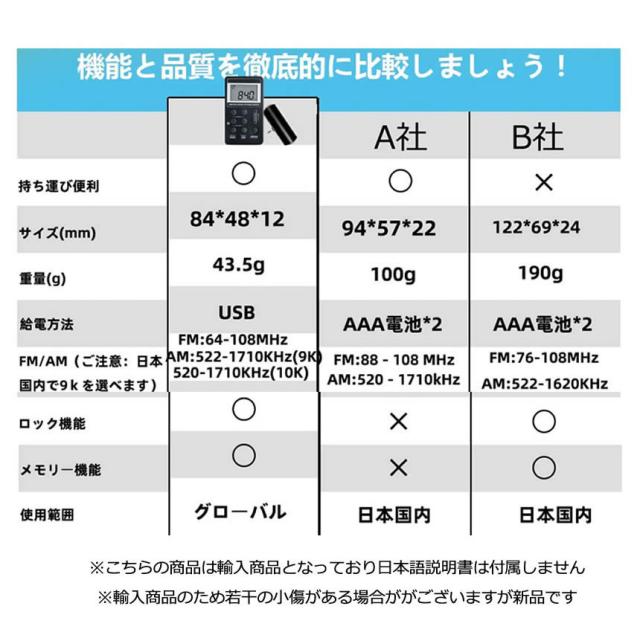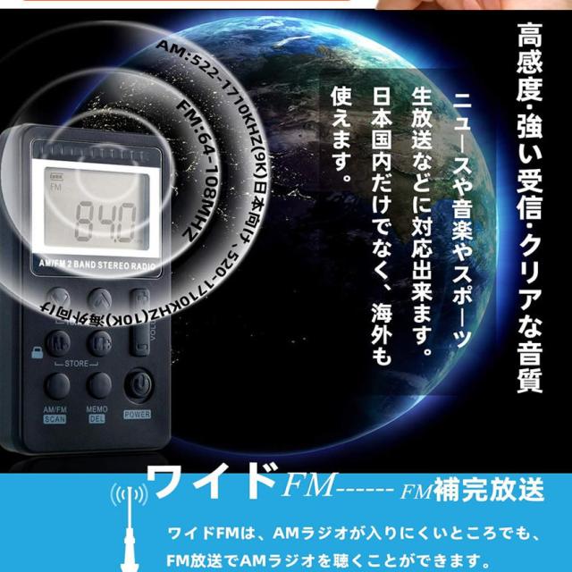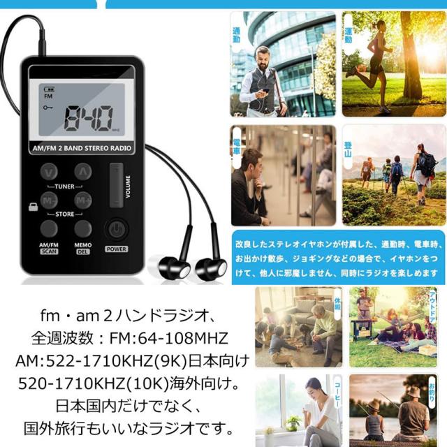 DSP技術を採用されたミニデジタルラジオは強大なデータ処理と高速運行、信号安定、高感度、受信強い、オーディオの伝送は失わない、fm・am2ハンドラジオ、全週波数:FM:64-108MHZ AM:522-1710KHZ(9K)日本向け、520-1710KHZ(10K)海外向け。日本国内だけでなく、国外旅行もいいなラジオです。