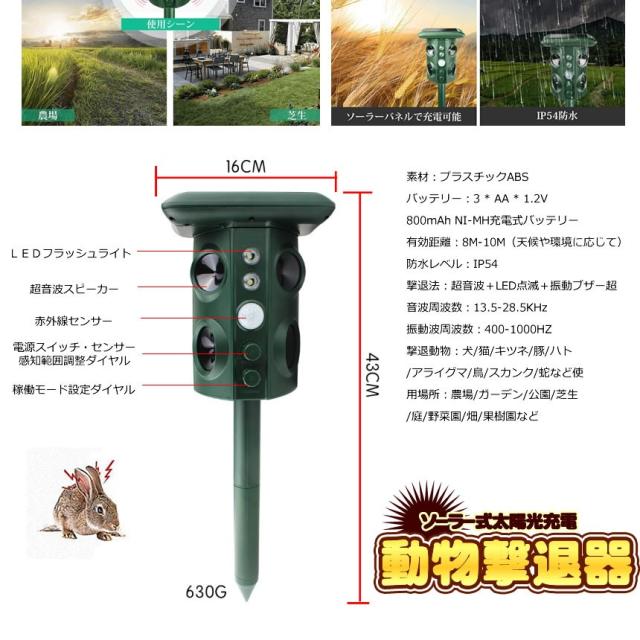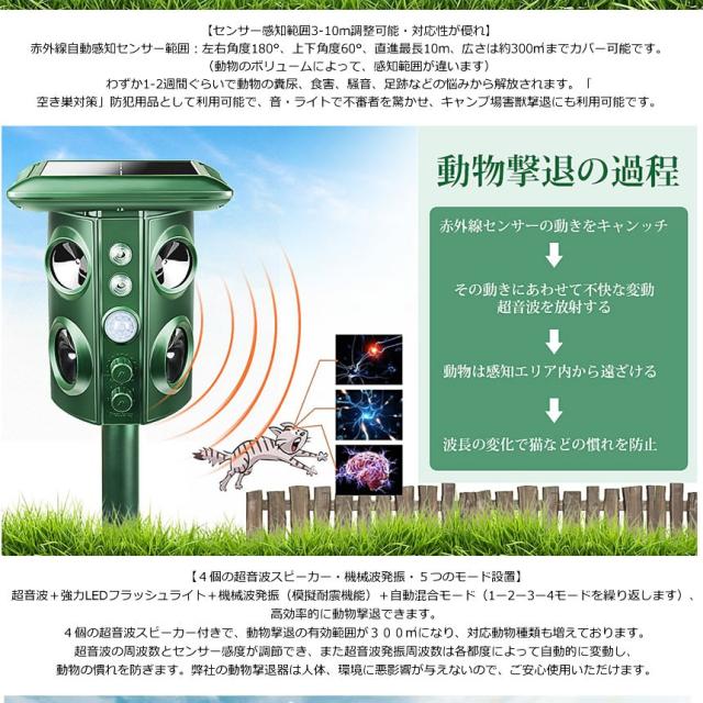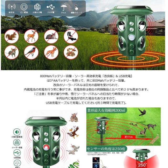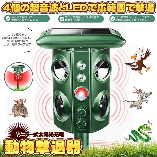 予約 動物撃退器 害獣撃退 4個超音波スピーカー 広範囲 強力LEDフラッシュ USB充電 野良犬 猫よけ カラス 鳥 ネズミ 糞害 食害 防水 庭 畑 5つのモード GEKITAI m-mh0609-50a