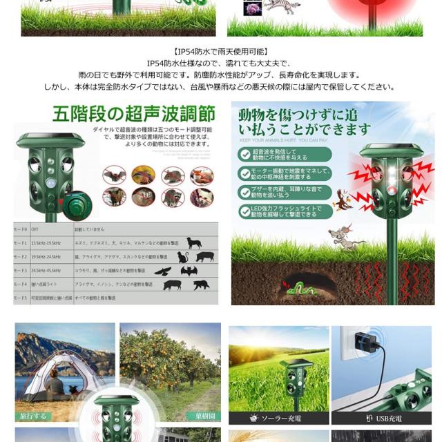 超音波+強力LEDフラッシュライト+機械波発振(模擬耐震機能)+自動混合モード(1ー2ー3ー4モードを繰り返します)、高効率的に動物撃退できます。4個の超音波スピーカー付きで、動物撃退の有効範囲が300m2になり、対応動物種類も増えております。超音波の周波数とセンサー感度が調節でき、また超音波発振周波数は各都度によって自動的に変動し、動物の慣れを防ぎます。弊社の動物撃退器は人体、環境に悪影響が与えないので、ご安心使用いただけます。
