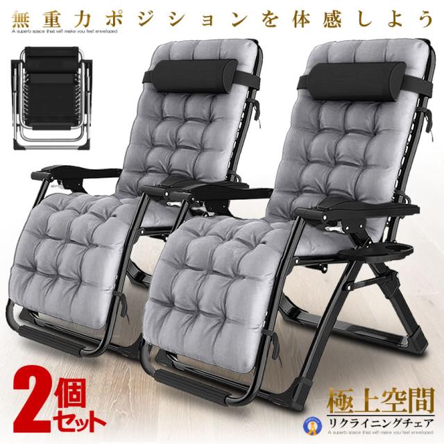 2個セット リクライニング チェア VIP型 グレー クッション 折りたたみチェア 枕つき リビング 金属ロック 角度調節 耐荷重200kg RIKUCHAI-A-GY kg0620-14a