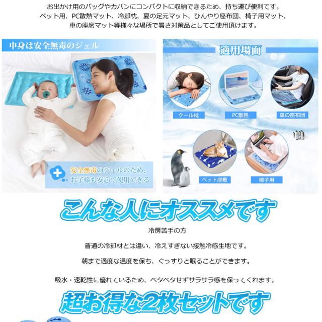 吸熱力高いジェルを採用しており、体の熱をすばやく吸収して、温度を下げてくれます。こ簡単な物理原理で、赤ちゃんや子供、ペットもご安心に使用していただけます。