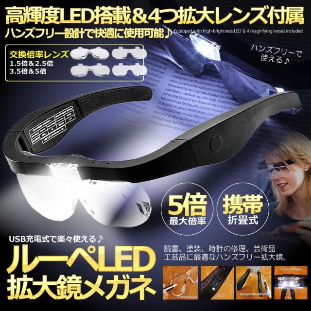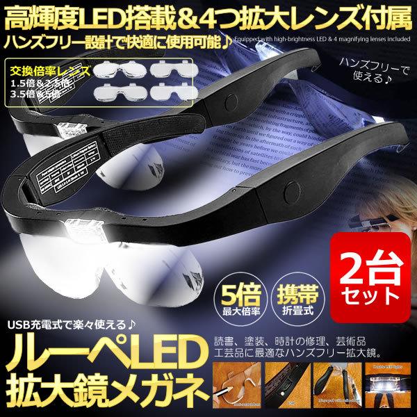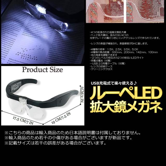 2個セット ルーペ LEDメガネ レンズ 1.5倍 2.5倍 3.5倍 5倍 レンズ交換 拡大鏡 角度調節 メガネ両用 LEDライト付き 4LEGEGG s-ki0629-10a