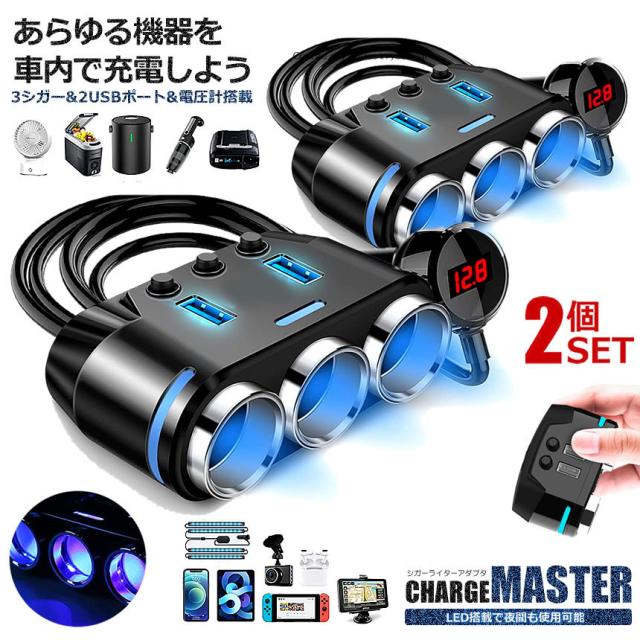 2個セット シガー増設 シガーアダプタ 12V 24V 対応 急速充電 USB 2ポート 電圧計付き LED電圧表示 充電器 車載 シガーチャージャー CIGAMAST s-kj2210-52a