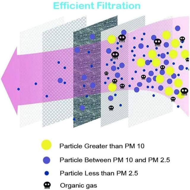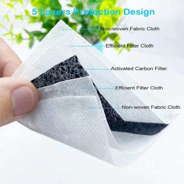 フィルター保護の5つの層:最初の層は大きな粒子をブロックします; 2番目の層は活性炭フィルター層、有害な化学物質の吸着です; 3番目と4番目の層は0.03ミクロンのPM2.5粒子をフィルターできます.5番目の層は非の内側層です織布、快適で通気性、汚れに強いので、より衛生的に着用できます。